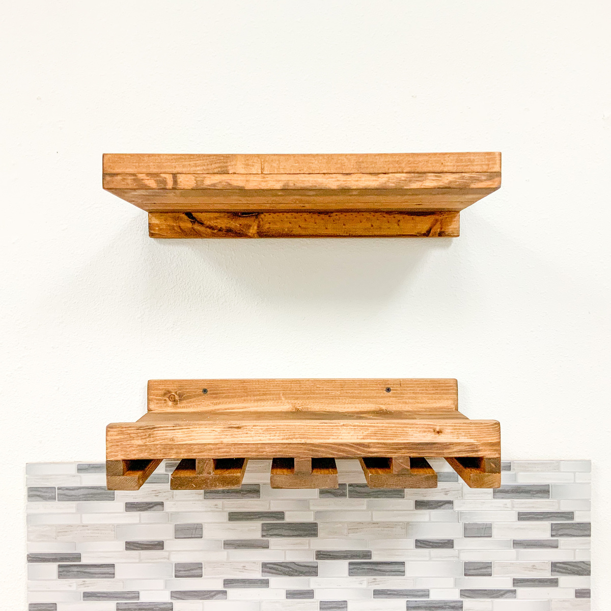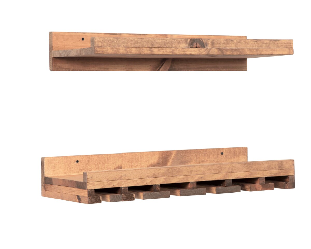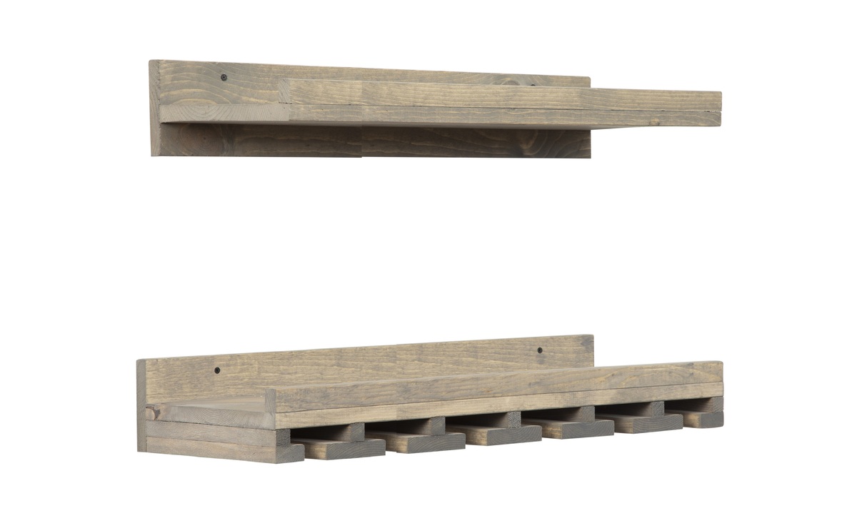 Transform your home bar or dining space with Intrinsic Haven's wall-mounted wine rack and glass stem holder. This beautifully handcrafted piece combines rustic charm with practical storage, featuring dedicated spaces for wine bottles and stemware. Crafted from solid pine wood in Texas, this versatile rack comes in Dark Walnut, Grey, or Walnut finishes to match your decor. Available in multiple sizes (20", 24", 30", and 36"), each shelf provides 4.25 inches of height and 10 inches of depth, offering ample space for your collection. The thoughtful design includes a decorative shelf for bottles and a separate rack for hanging stemware, making it both functional and visually appealing. This statement piece brings together classic style and smart storage, perfect for wine enthusiasts who appreciate both form and function in their home decor.