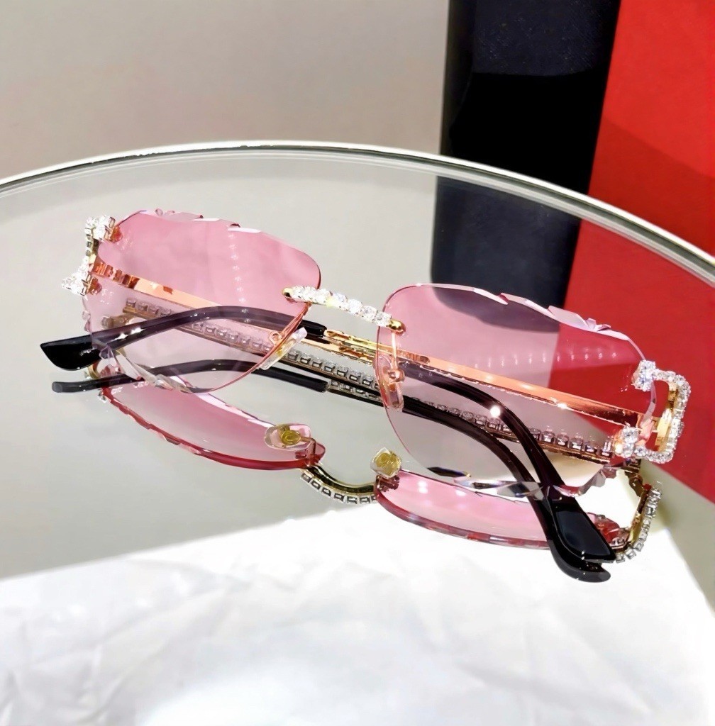 Elevate your style with our Rimless Round Cut Lens Sunglasses featuring high-quality gradient pink gray lenses and a gold frame. Adorned with sparkling rhinestones, these luxury sunglasses offer UV400 protection and standout shine. Perfect for both men and women, they deliver high-end fashion with a lightweight, comfortable fit for everyday glam.