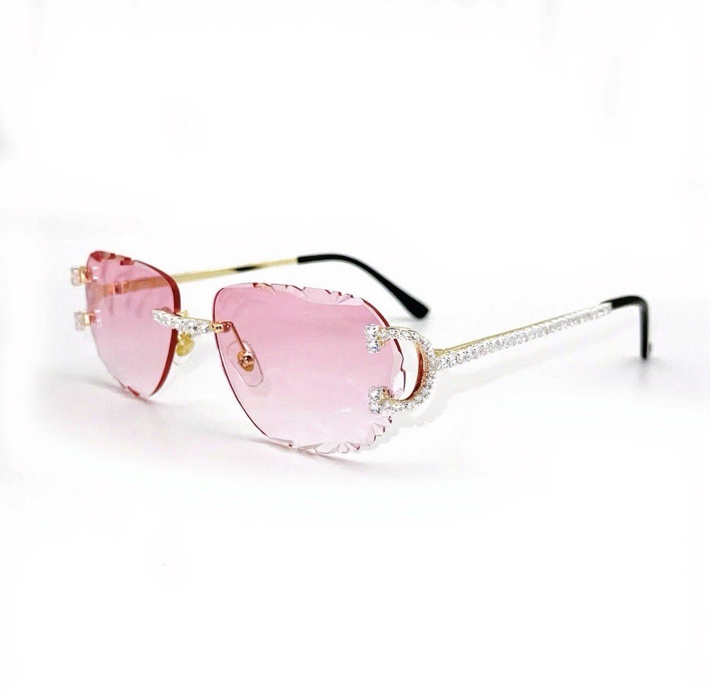 Luxury Rimless Round Cut Sunglasses ? Pink Gray Lens Gold Frame with High-Quality Rhinestones and Diamond Shine UV400 Protection