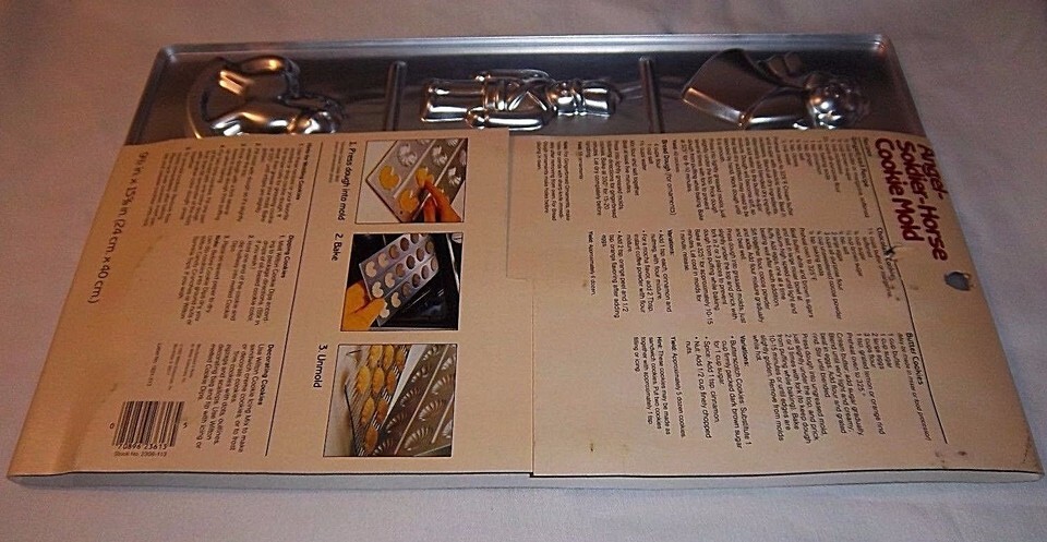 Each 9-1/2" x 15-5/8" pan features 3 mold designs to make 9 cookies