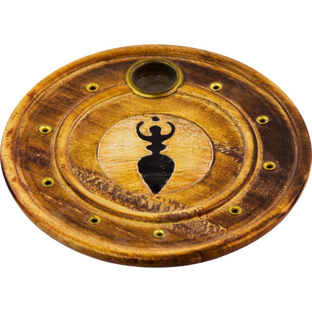 This rustic 4 inch diameter wooden incense plate holds both sticks and has an insert for cones. A goddess symbol adorns the center.