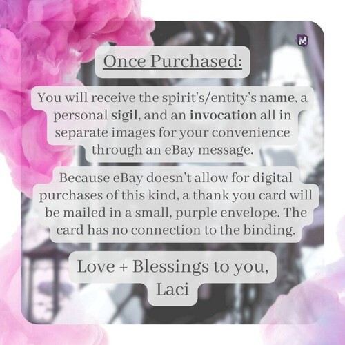 Once purchased, You will receive the spirit?s/entity?s name, a personal sigil, and an invocation all in separate images for your convenience through an message. Please give me some time in case I am asleep or otherwise occupied. I will send everything along as soon as I can.