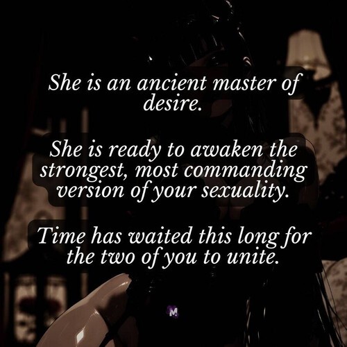 She knows precisely what will make you feel powerful, what will make you take charge of any moment of passion. And she will pull this version of you forward, like a master preparing her heir. There is no part of your potential she cannot see. She will make it real, and you will feel it all, and remain strong and in command.