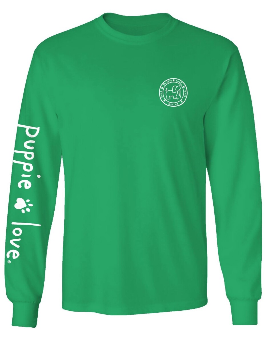 Puppie Love Christmas Long Sleeve T-Shirt, Green Cotton, Santa Mailbox Design