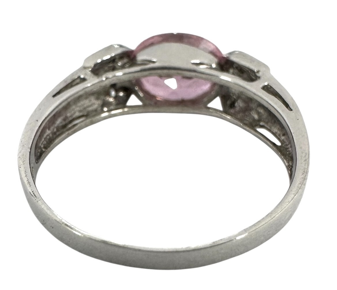 Type: Cluster ringWeight: 2.8Karat: .925Metal: SilverGender: Women'sStyle: ClusterSize / Length: 10.5Owner applied: 925Stone 1 quantity: 1Stone 1 shape: OvalStone 1 color: PinkStone 1 weight (total): 3.00Stone 2 Quantity: 8Stone 2 Shape: RoundStone 2 Color: ClearStone 2 Weight (Total): .08Stone 2 Type: Cubic ZirconiaCondition:Used