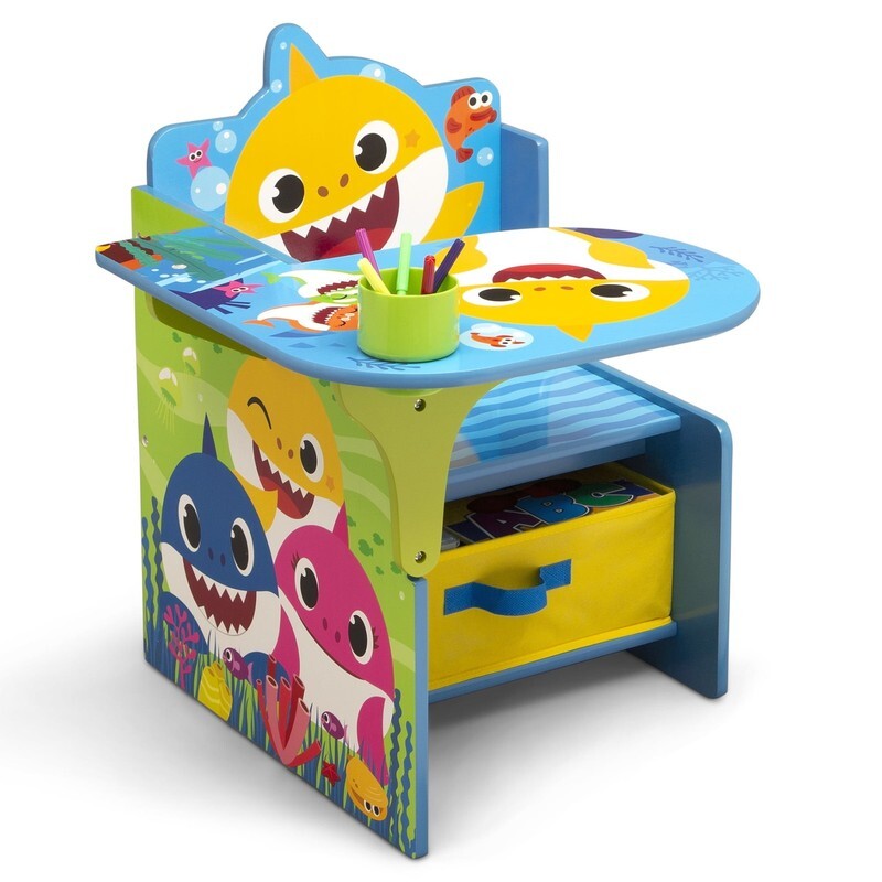 This Baby Shark Chair Desk with Storage Bin by Delta Children offers kids the perfect spot for snack time, crafts, playtime or homework. This smart and sturdy chair with colorful graphics of Baby Shark also features a built-in cup holder to hold markers and a fabric storage bin underneath for additional art supplies or toys. Perfectly sized, this durable chair and desk combo has a large work surface and low height that makes it easy for preschool kids and toddlers to get in and out on their own. About Baby Shark: Baby Shark and his best friend William take fun-filled comedic adventures in their community of Carnivore Cove, meeting new friends and singing catchy tunes along the way. Baby shark, doo, doo, doo, doo, doo, doo.