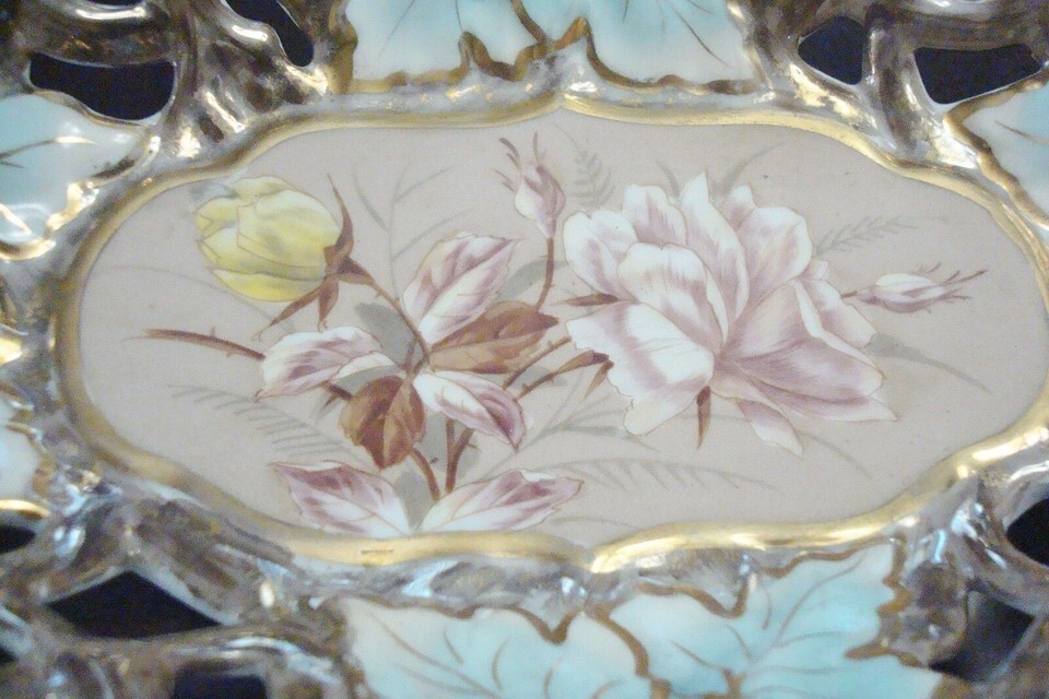 CARL THIEME - SAXONIAN PORCELAIN FACTORY (Germany) - c1910s erticulated gold, turquiose and brown oval vanity tray, very good condition, no chips or hairlines, some light surface scratches commensurate with age