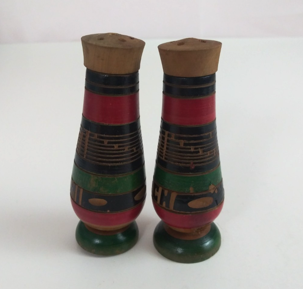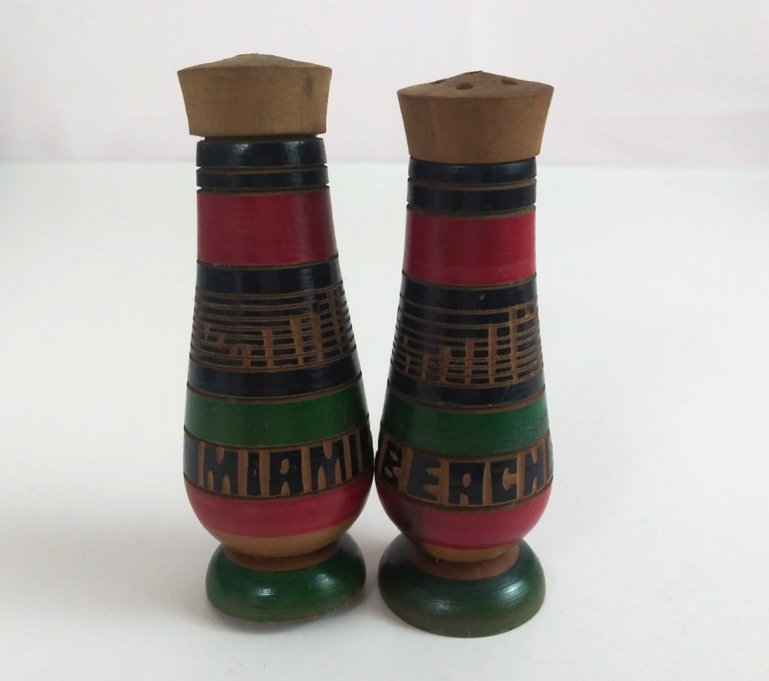 Vintage Miami Beach Colorful Hand Carved Wooden Salt & Pepper Shakers Mexico