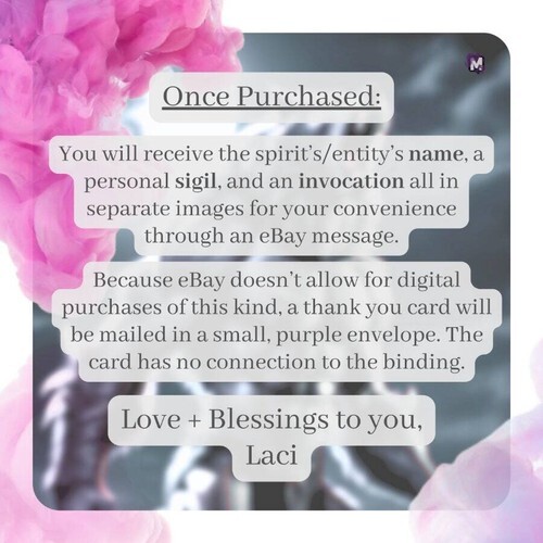 Once purchased, You will receive the spirit?s/entity?s name, a personal sigil, and an invocation all in separate images for your convenience through an message. Please give me some time in case I am asleep or otherwise occupied. I will send everything along as soon as I can.