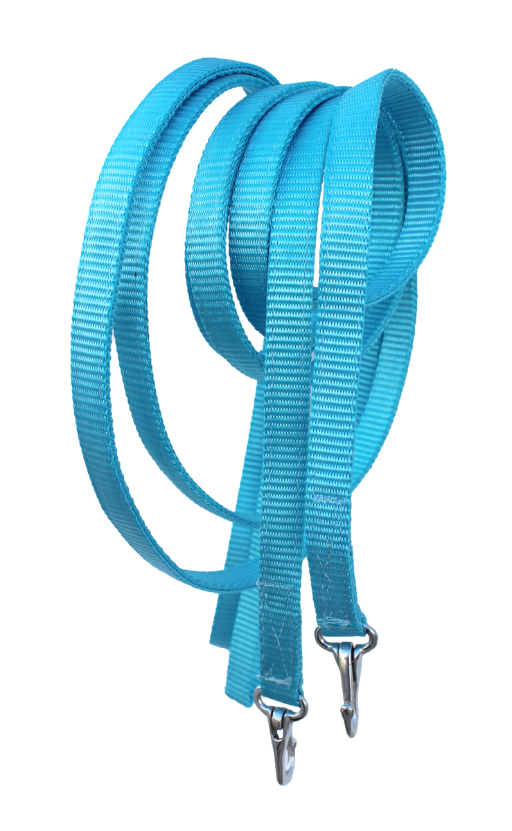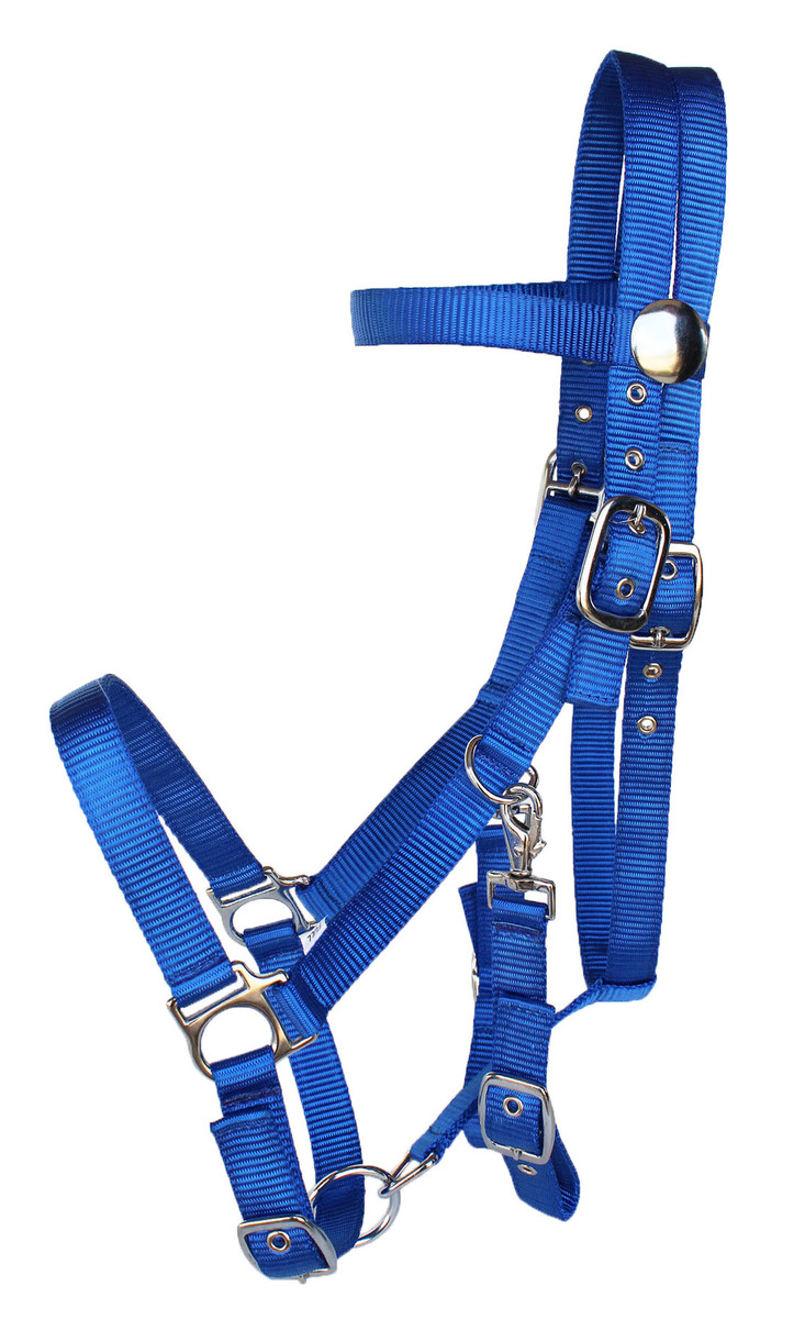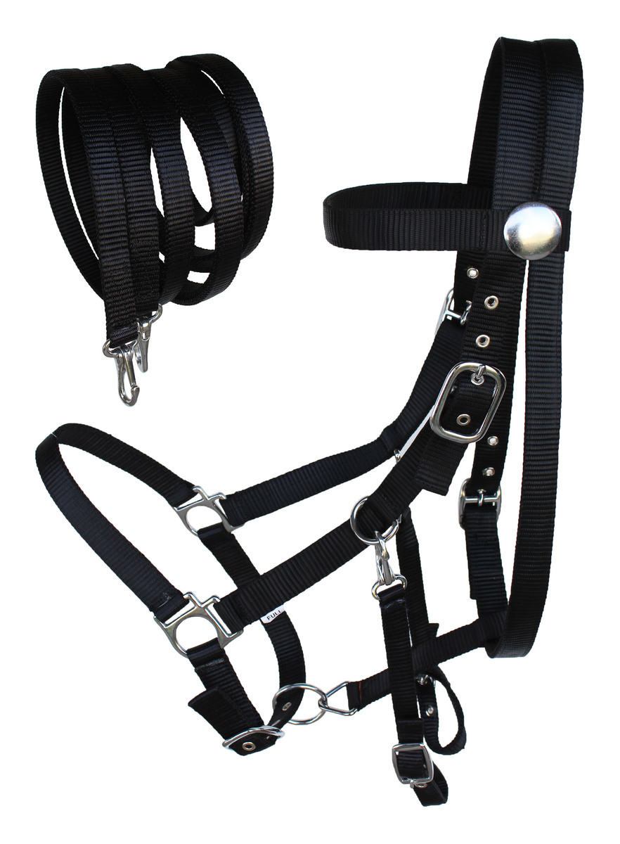 Nylon combination halter bridle combo with reins. This combination bridle is constructed of durable nylon with nickel plated hardware. Easily adjusts using buckles on crown, nose and detachable scissor snap bridle cheeks. Comes with 3/4" x 7' nylon rein with spring loaded snap ends.