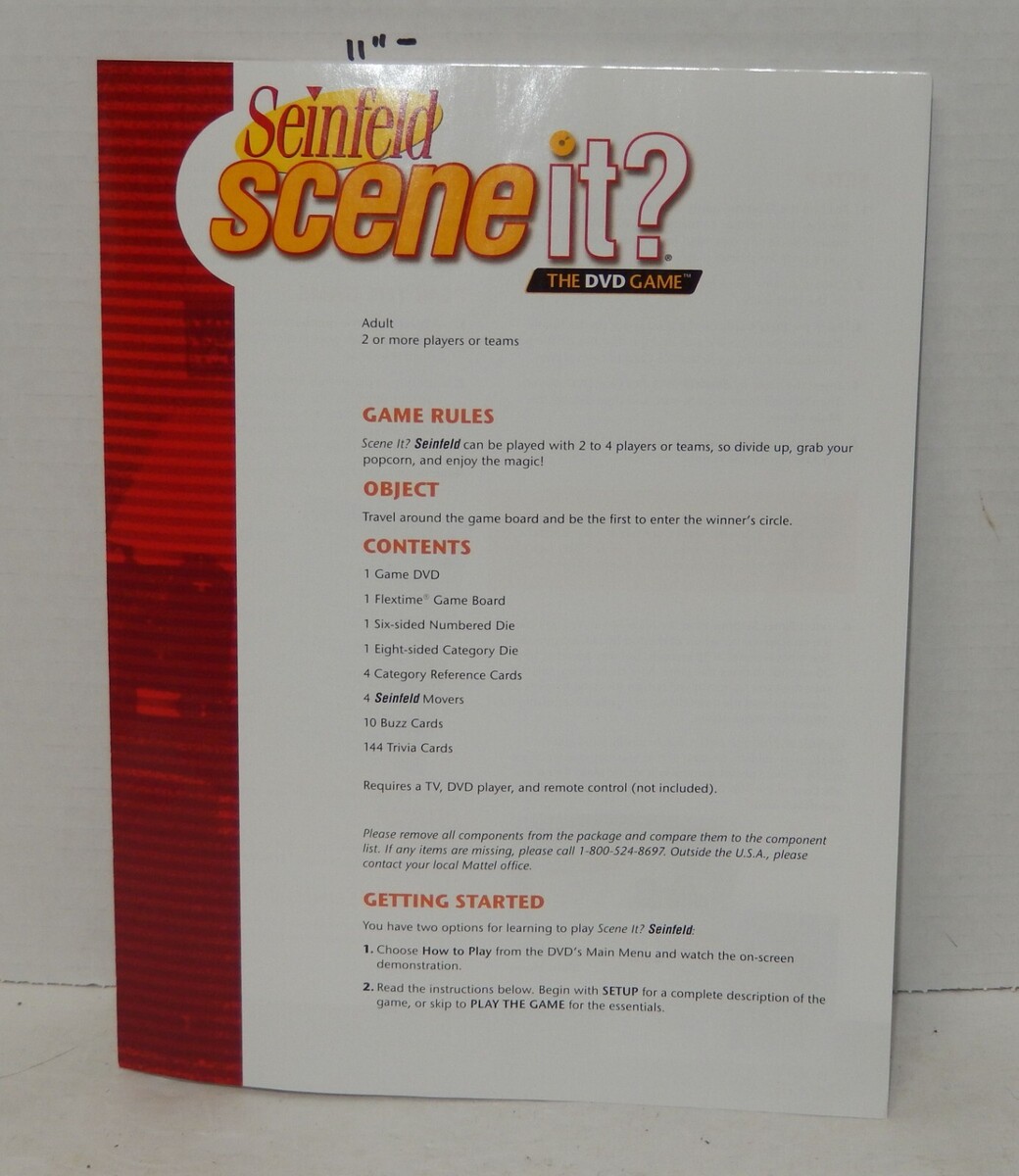 For Sale is a Scene it Seinfeld Edition DVD Board Game Replacement Instructions Piece Part. it in good Used condition. this for the Replacement Instructions ONLY as seen in the pictures provided what you see is what you will receive. Please ask Any and All Questions prior to purchasing. Fast Same or Next day shipping with Free Delivery Confirmation within the U.S. Payment Due within 7 days of purchase (if you need more time please let us know In advance) we love to combine shipping is always a Yes and Most of the time Additional Items Ship for free.