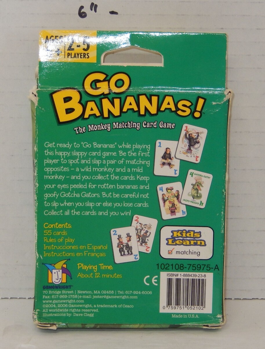 For Sale is a 2006 GAMEWRIGHT Go Bananas! THE MONKEY MATCHING Kids Card Game 100% Complete. what you see is what you will receive. Please ask Any and All Questions prior to purchasing. Fast Same or Next day shipping with Free Delivery Confirmation within the U.S. Payment Due within 7 days of purchase (if you need more time please let us know In advance) we love to combine shipping is always a Yes and Most of the time Additional Items Ship for free.