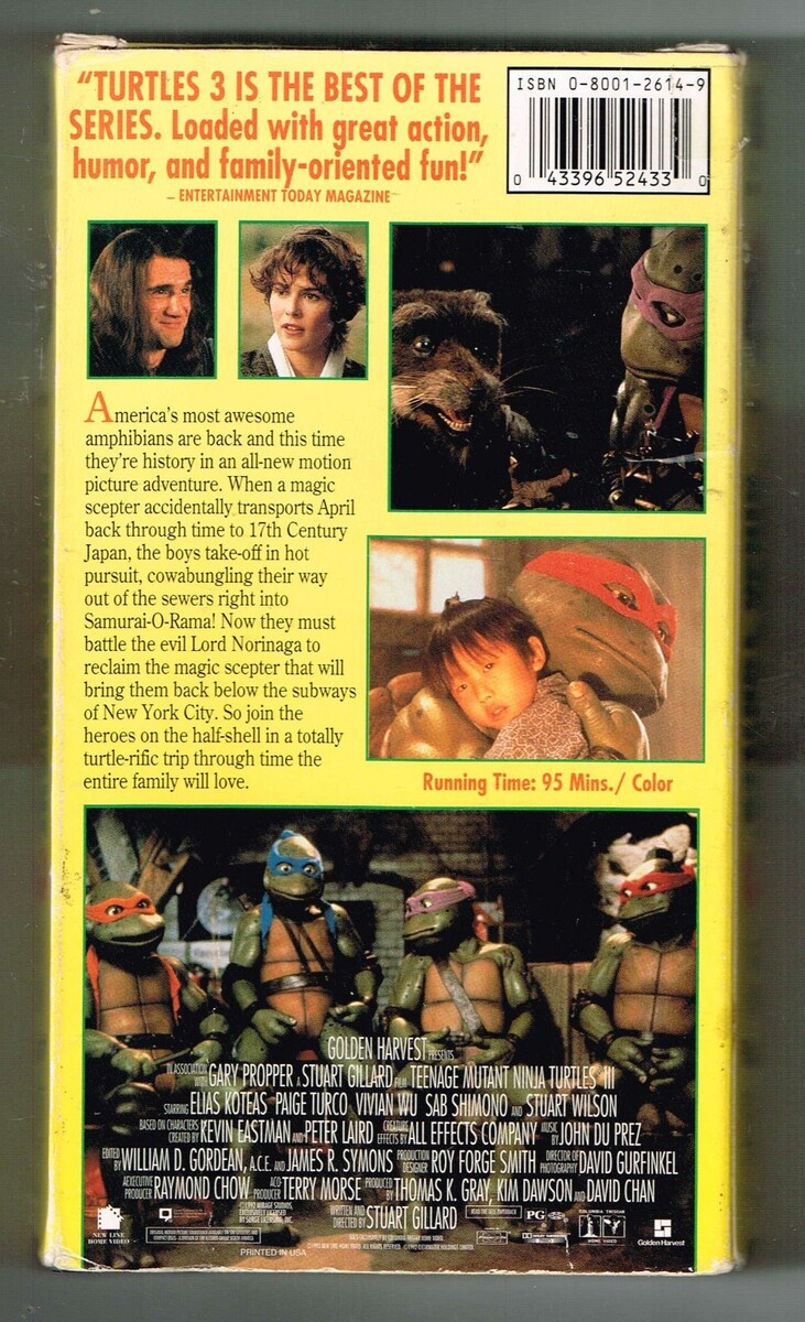 This is the original VHS release of the third live-action Turtles movie, Teenage Mutant Ninja Turtles III, from 1993! Get ready for a totally turtle-rific trip through time with America's favorite amphibians.
