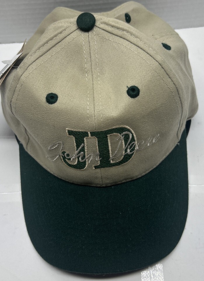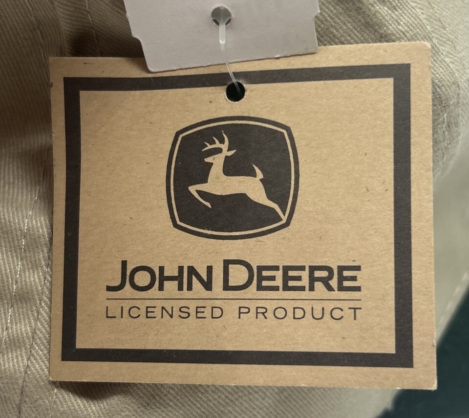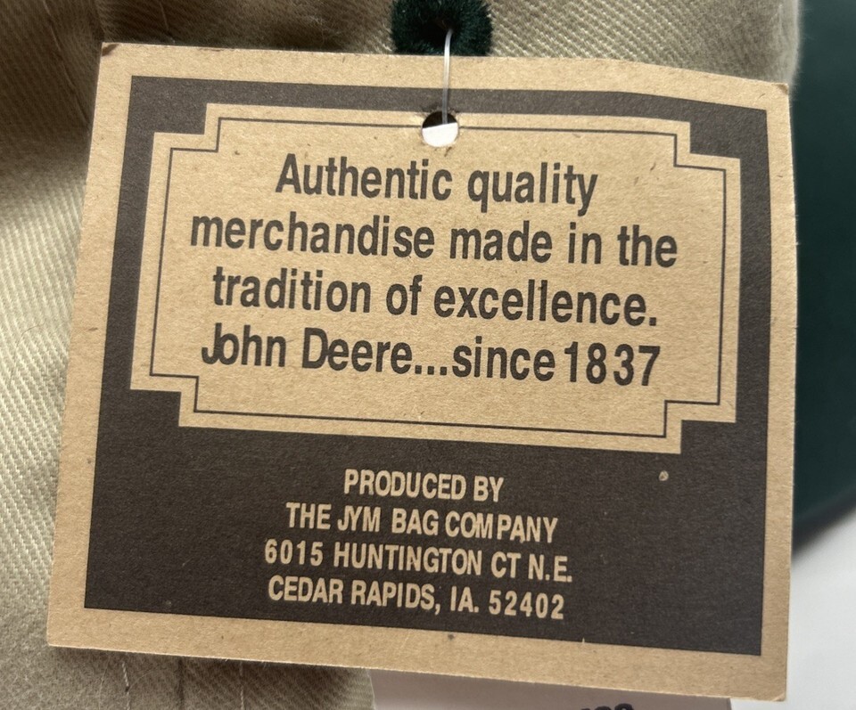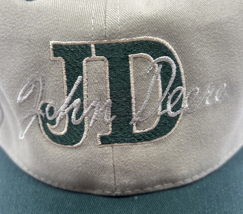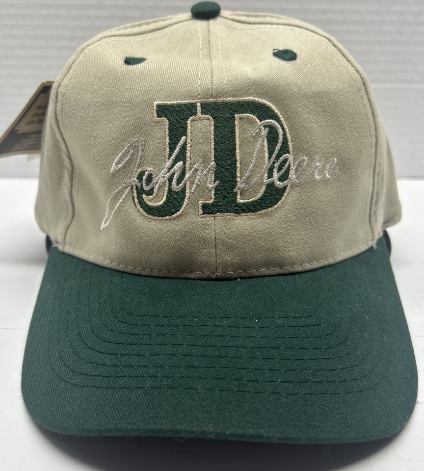 The product is a vintage John Deere baseball style truckers hat/cap in beige with hunter green accents. It features JD initials and John Deere in script lettering , adjustable sizing, and a theme of farm tractor agriculture. The cap is made of poly cotton fabric and is designed for unisex adults. It is brand new with tags and must be hand washed. The hat is one size fits all and manufactured in Bangladesh. Has been cleaned per policy. Thank you for your interest in our listing and please feel free to visit our store for more great items.
