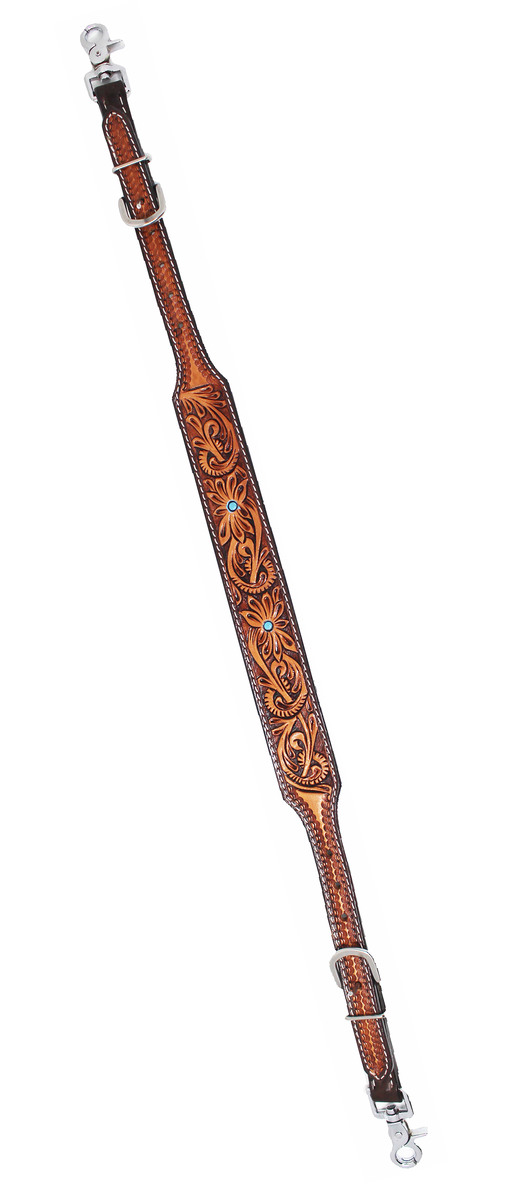 Challenger wither breast collar strap made from top quality full grain hand-tooled leather. Beautifully accented with a brown floral tooled antique finish. Wither straps helps keep breast collar in perfect position. Easily adjustable, complete with quick trigger snaps on both ends. Rust-free stainless steel hardware.