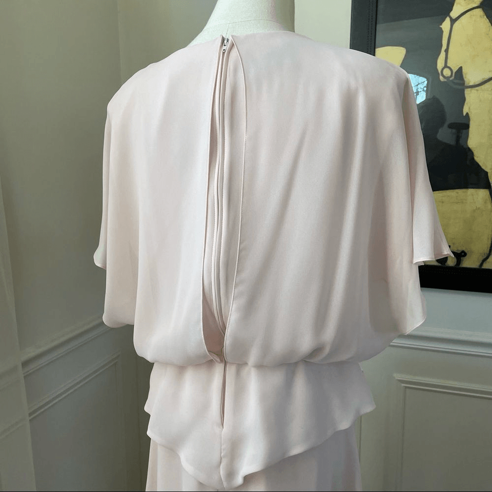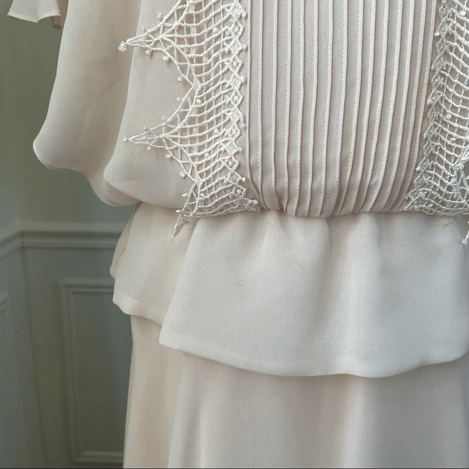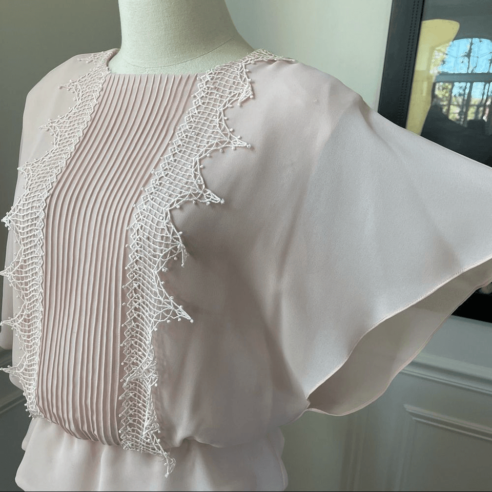 Vintage 80s Ursula of Switzerland pedal pink dress with blouson top, flutter sleeve and lined lightweight chiffon with pleat front and lace detail. Back zip with a talon zipper. Light shoulder pads. Measurements are approximate and taken while laying flat: 47? shoulder to hem, 21? from armpit to armpit and the elastic waist measures 14 to 17? straight across, unstretched to stretched. Vintage 11/12 but measures like a modern Medium