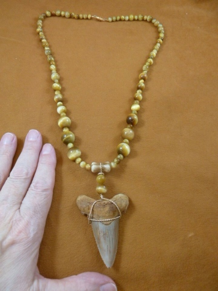 sr269-3) 2-3/4" Fossil AURICULATUS SHARK TOOTH brown tan Tigers eye 26" necklace