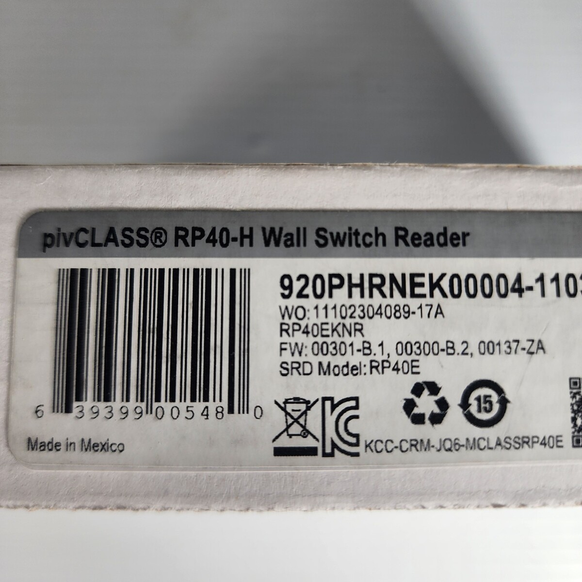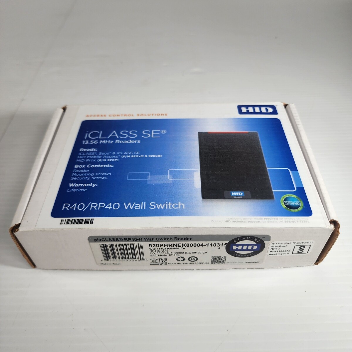 The HID 920NHPTEK000HR-L02 / RP40EKNR RP40-H pivCLASS Wall Switch Card Reader 110315 is a smart card reader designed for keyless access systems. It is hardwired and manufactured in the United States by HID, a reputable brand in access control equipment. This unit, with model number 920PHRNEK00004, is a single unit located in Rack FB of the warehouse. The product provides secure access control for facilities, making it a valuable tool for businesses looking to enhance their security systems.
