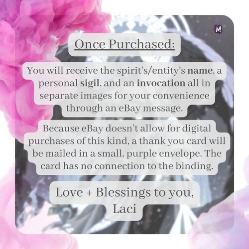 Once purchased, You will receive the spirit?s/entity?s name, a personal sigil, and an invocation all in separate images for your convenience through an message. Please give me some time in case I am asleep or otherwise occupied. I will send everything along as soon as I can.