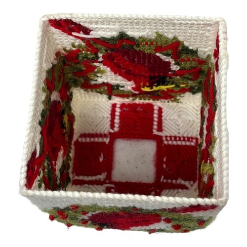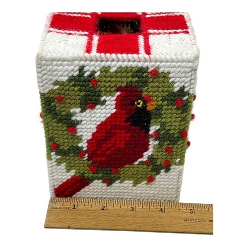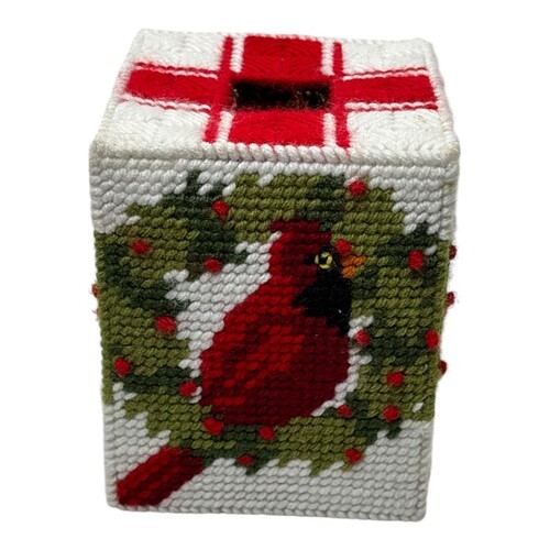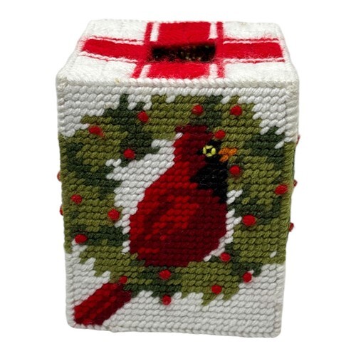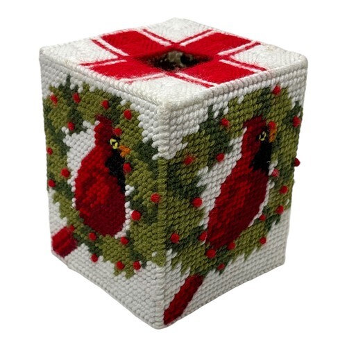 Tissue Box Cover Plastic Needlepoint Yarn Red Birds Cardinal Wreath Christmas