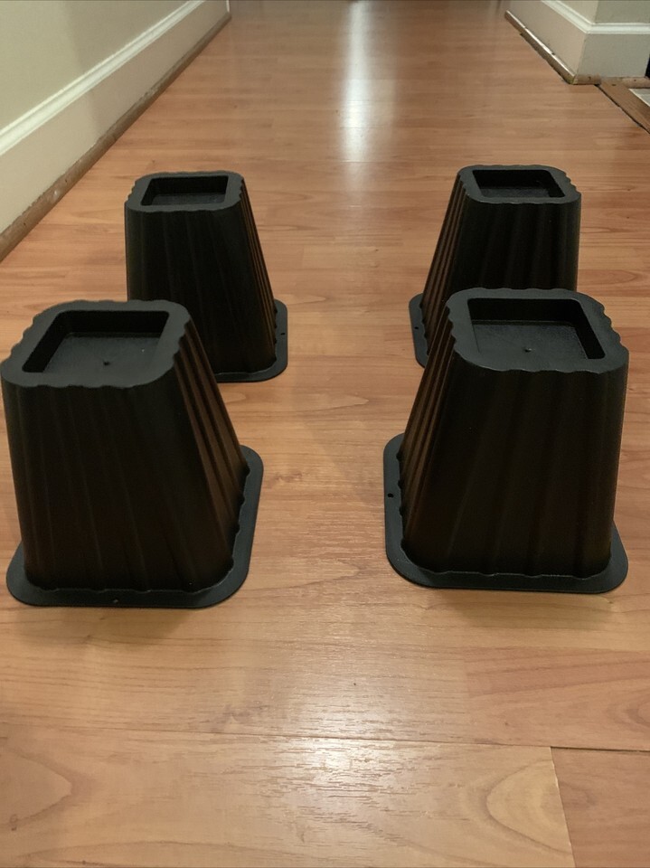Home Basics 4 Piece Plastic Bed Raiser Set Black 4.25x6.5 Inches in immaculate condition. These were taken out of the package and tried on the bed once.