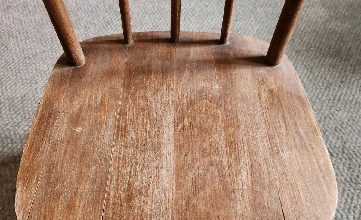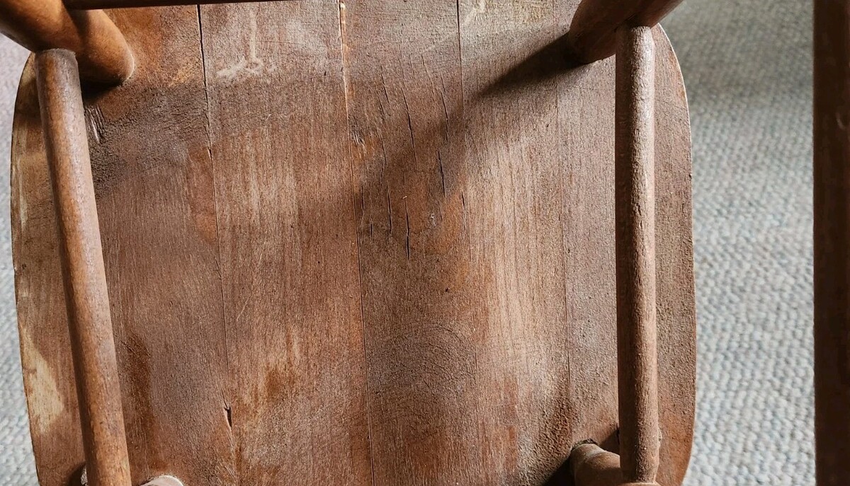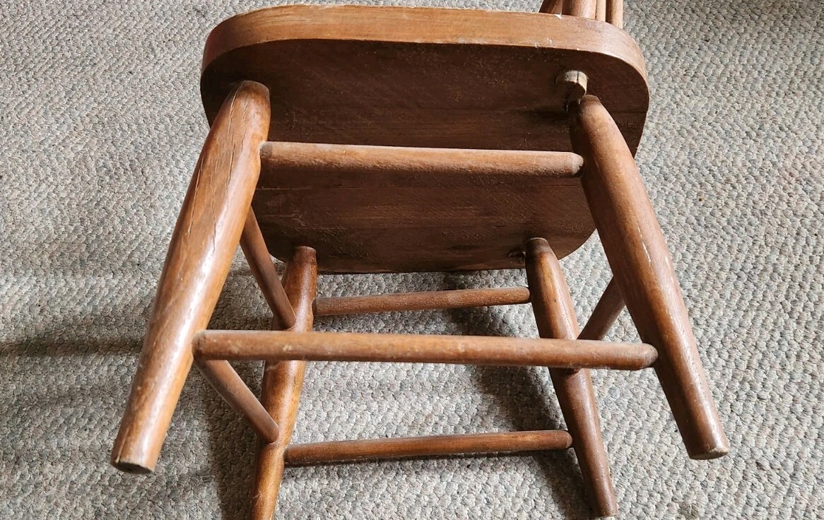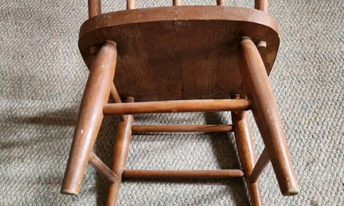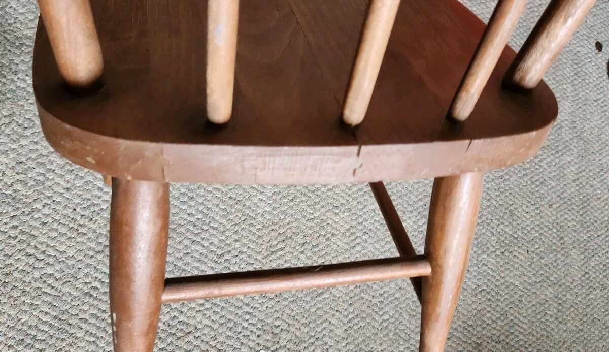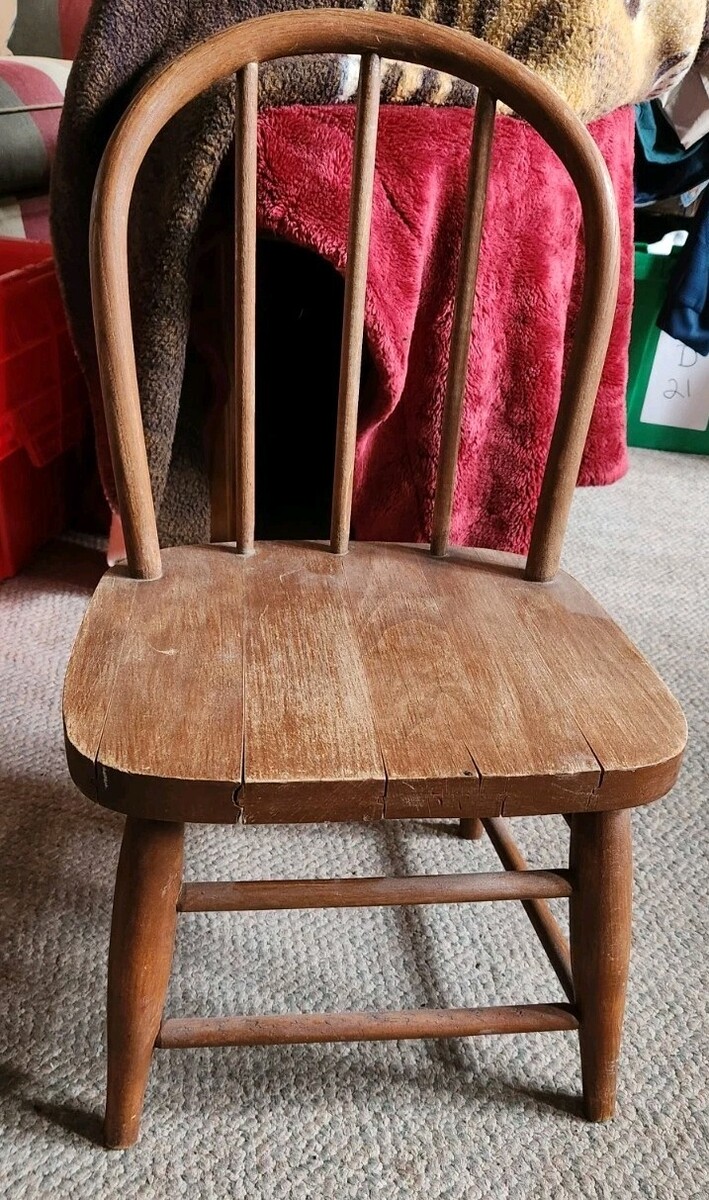 Neat vintage chair. Chair is sturdy but does have some cracks in the seat. One leg is a little loose in the hole. Might need a little glue. Measures. Approx 13x13 wide and 22 inches tall. Classic childs chair.