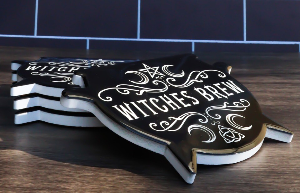 ? Are you a bit witchy and enjoy your brew, then we have the perfect coaster especially for you! Shaped like a witch's potion brew cauldron, these coasters bear the insignias of the triple moon, triskele and pentagram.