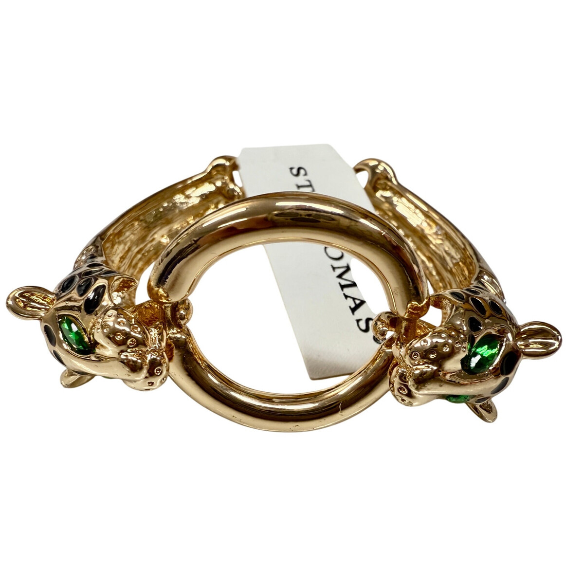 NEW Vintage St Thomas Gold Tone Green Eyes Double Leopard Head Toggle Bracelet