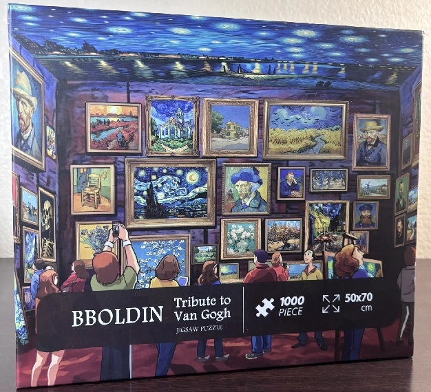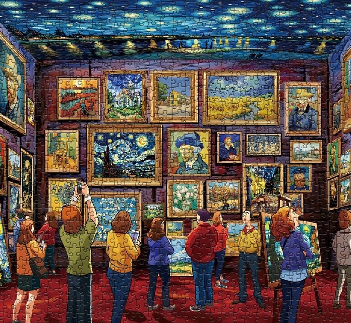 Experience the brilliance of Vincent Van Gogh with this art exhibition tribute puzzle. Dive into a kaleidoscope of his masterpieces, paying tribute to the legacy of this iconic artist. Each piece is a nostalgic journey, celebrating the beauty and emotion of Van Gogh's immortal creations. The puzzle consists of 1000 pieces, each labeled with a letter on the back. Meticulously crafted from premier 100% recyclable white cardboard, with top-of-the-line ink printing ensuring sharp pixels and enduring, rich colors that won't fade.