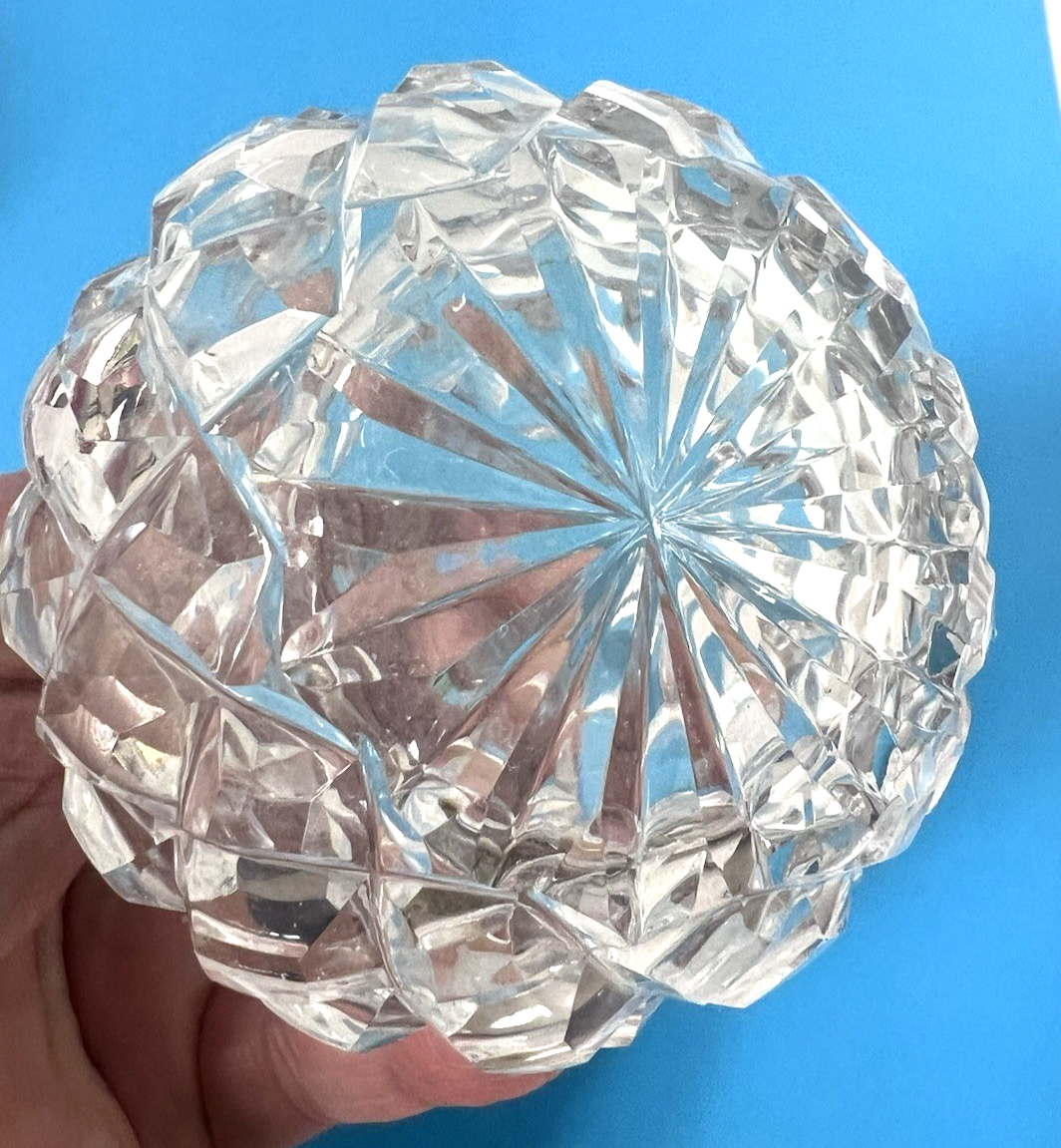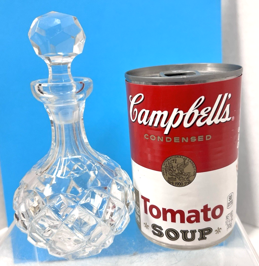 Beautiful Faceted Glass Perfume Scent Bottle w Stopper 5 1/4 inches In Great Shape The bottle is 4 inches tall alone and with stopper it is 5 1/4. the design is diamond points and very lovely. In very nice shape it might have a tiny fleabites but we honestly are not finding any..
