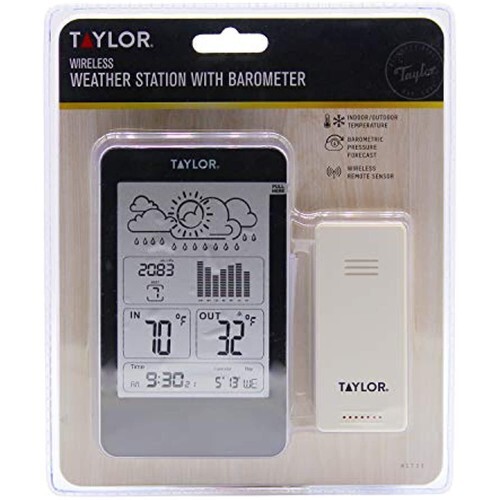 Monitoring temperatures and barometric pressure has never been easier with Taylor?s Wireless Weather Station with Barometer. The weather station reports on current temperatures in both F and C and can easily switch between temperature scales depending on your preference. The weather station accurately displays indoor temperature ranges of 32F to 122F (0C to 50C) and outdoor temperature ranges of -4F to 140F (-20C to 60C) using alkaline batteries or -40F to 140F (-40C to 60C) using lithium batteries. Always accurate, the wireless remote transmits data from up to 200ft away and withstands almost any weather condition. Calendar and alarm clock features are included.