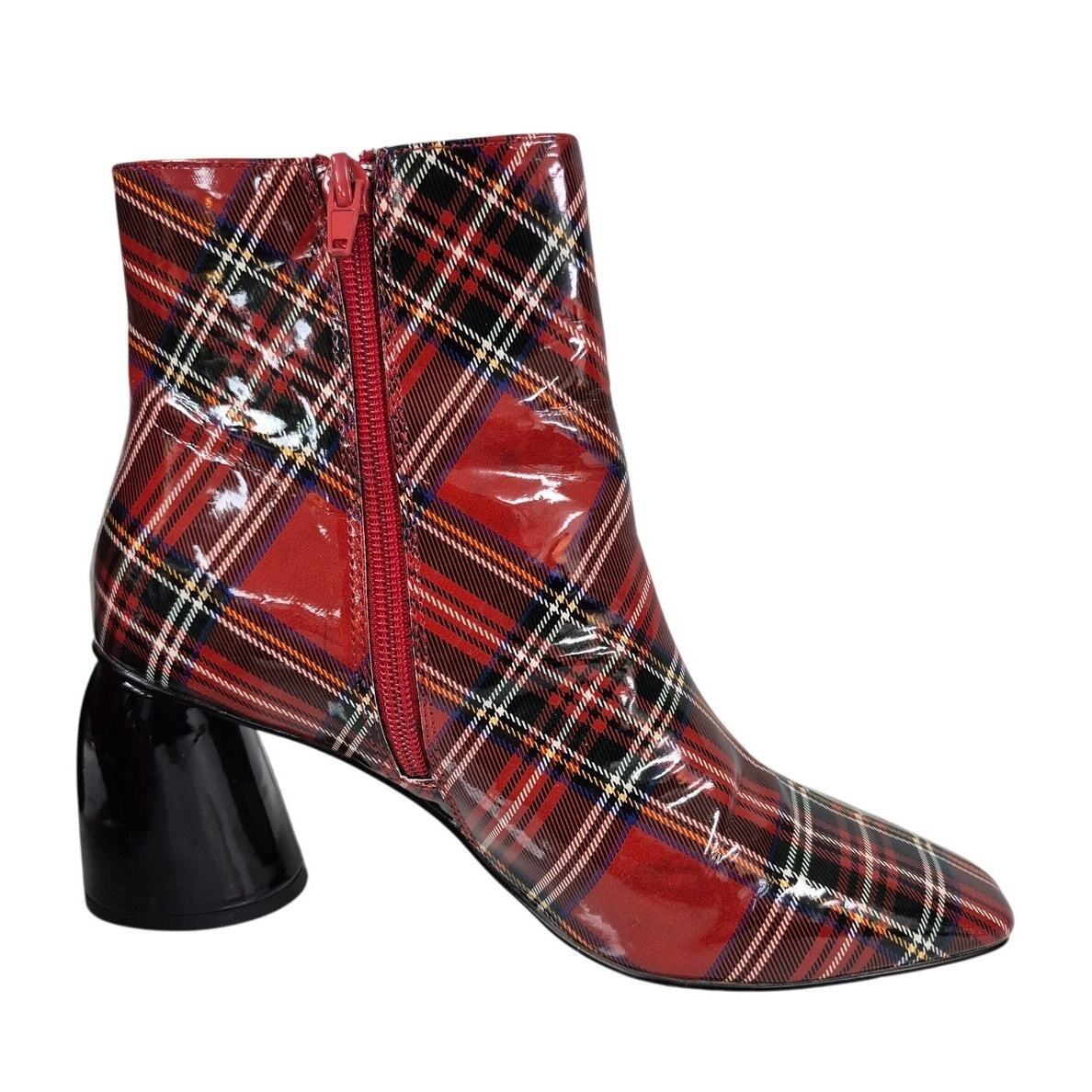Betsey Johnson Regie Red Tartan Plaid Boots Booties Sz 6.5 Wet Look Chunky Heel