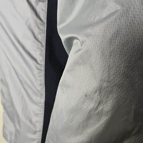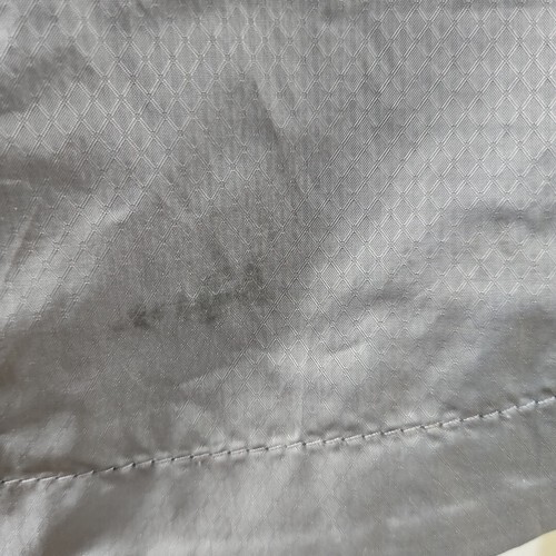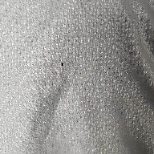 Tiny hole to the front right side, spots at the back hem and left sleeve.