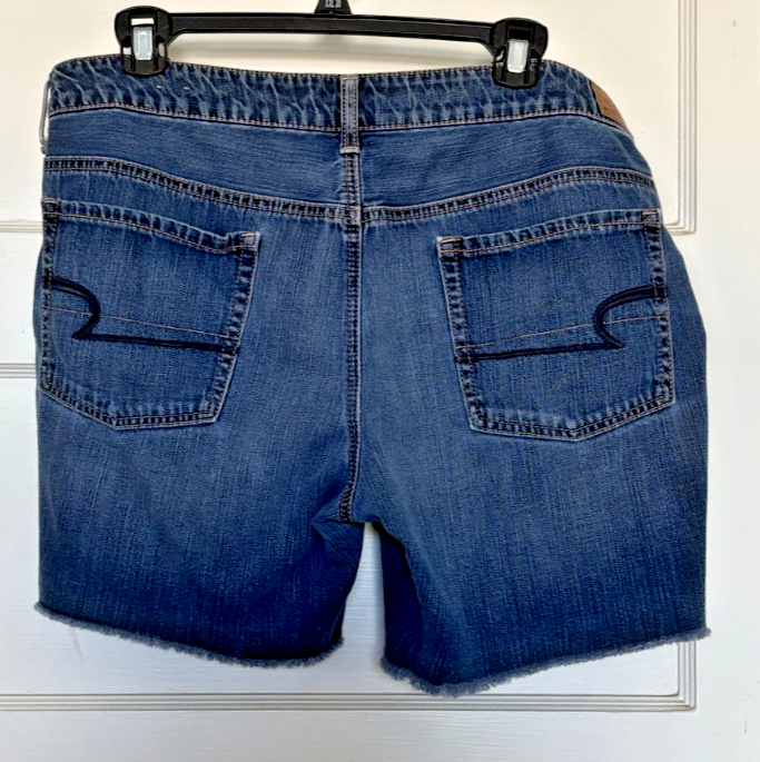 American Eagle Outfitters Dark Wash Cutoff Jean Shorts Size 14. Dark wash denim shorts with frayed edges. Features classic five-pocket design. Ideal for everyday style. 100% Cotton and machine washable. Waistband measures 38?. Inseam is 6?. Rise is 10?. Total length from the top of the waistband to hem is 15?. Very Good Used Condition - See Photos for Further Description.