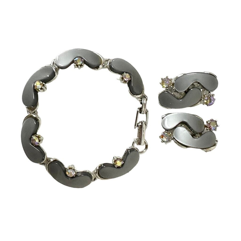 VTG 1950s Thermoset Gray AB Rhinestone Bracelet Earrings Set Atomic Mid Century