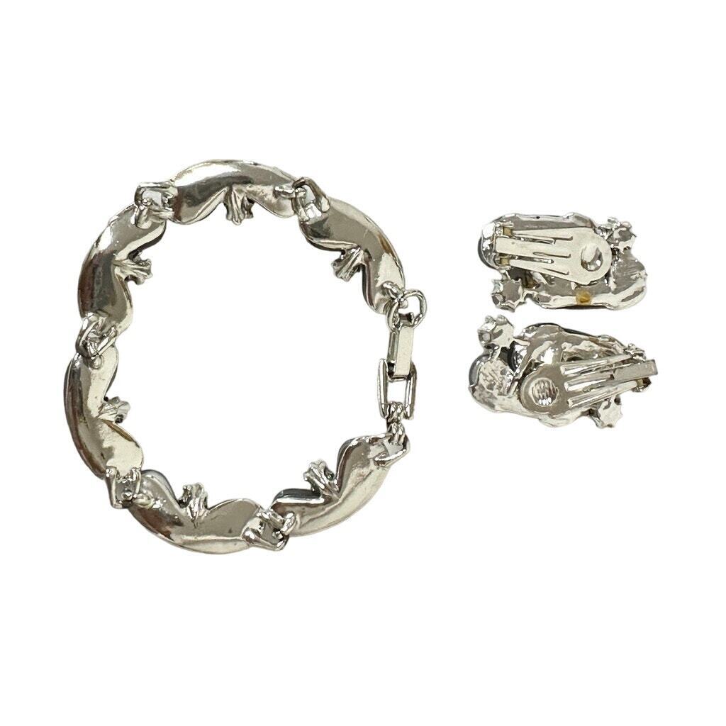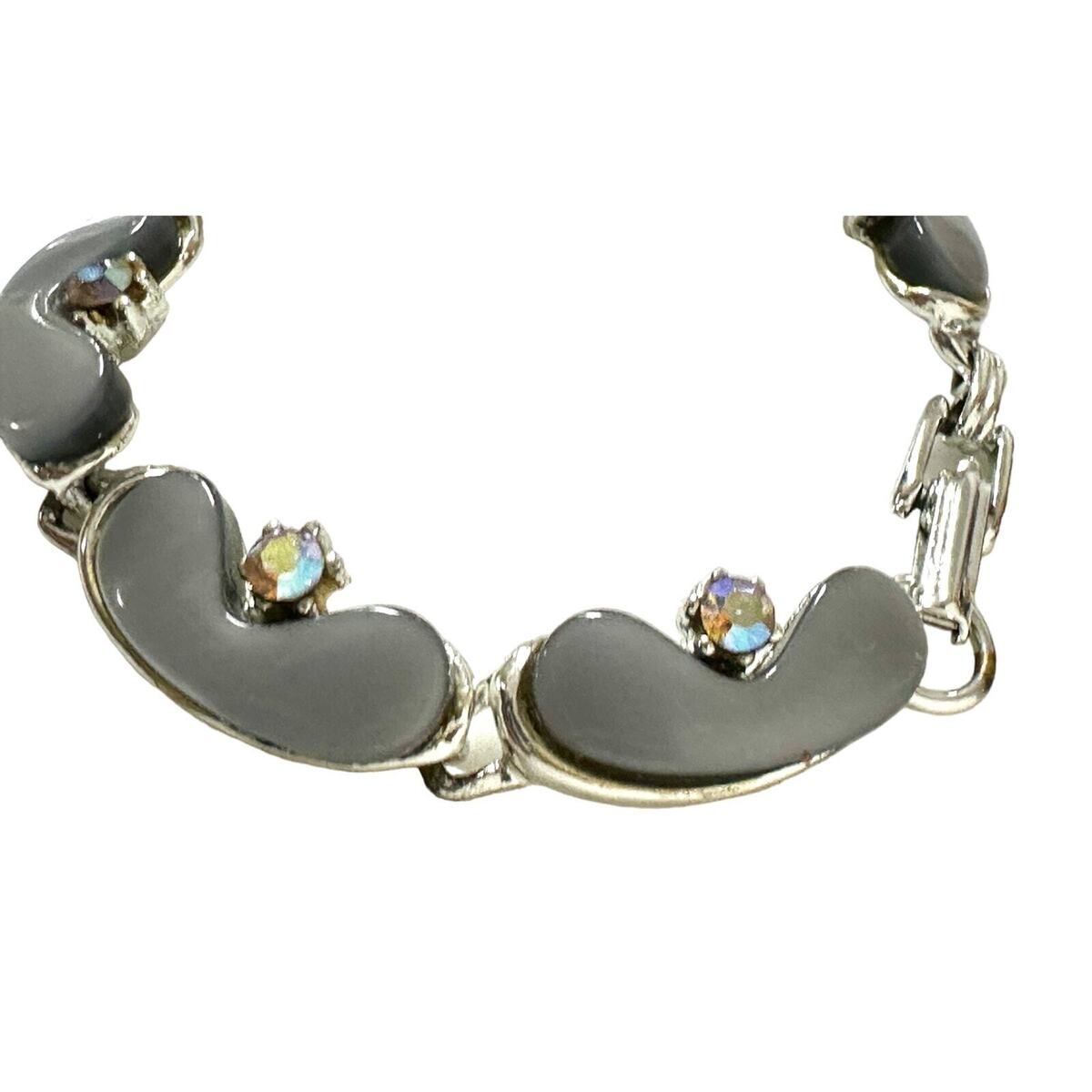 Step back into the atomic age with this stunning vintage 1950s thermoset jewelry set, featuring a silvertone bracelet and matching clip earrings. The glossy gray thermoset links are accented with sparkling Aurora Borealis rhinestones, giving the set that unmistakable mid-century glow. Bracelet measures just over 7", and the matching earrings are 1 OE" long ? the perfect retro statement. Condition is excellent ? gorgeous and ready to wear.