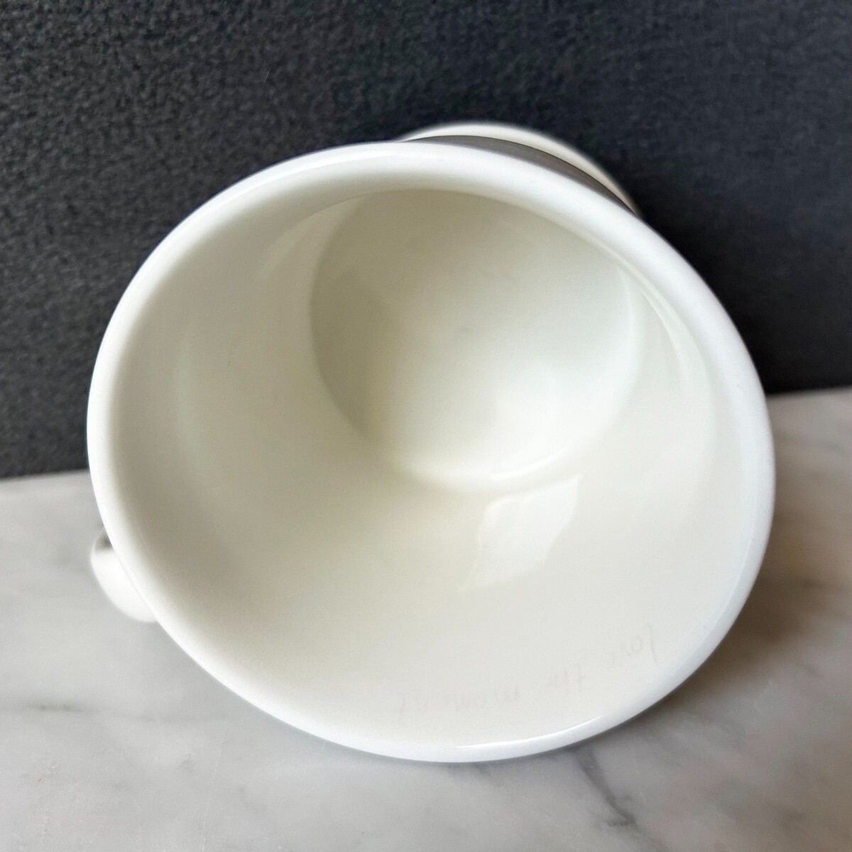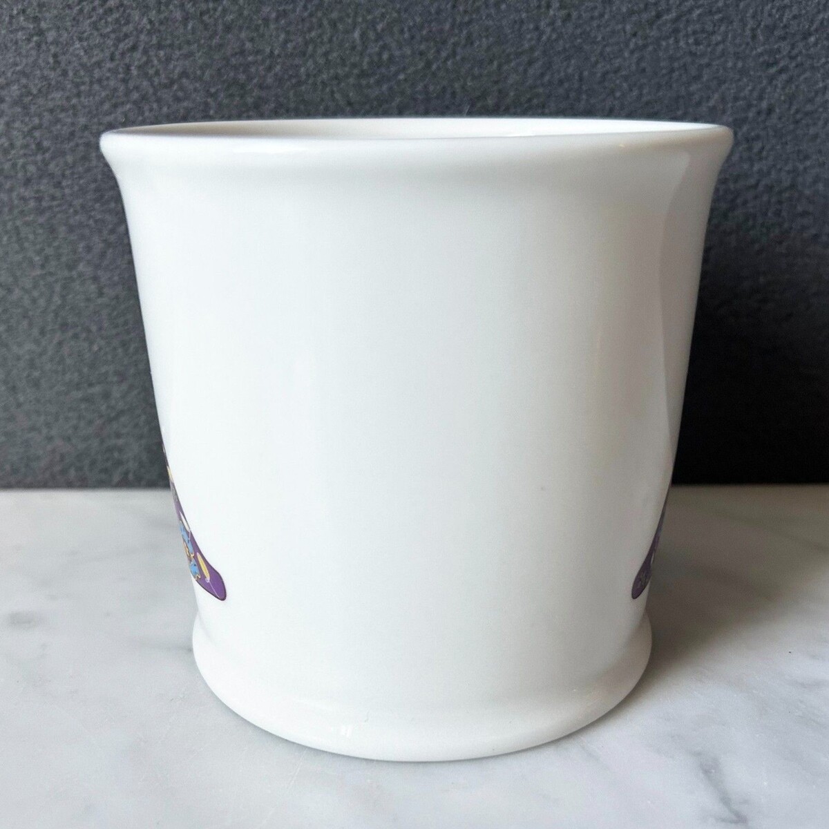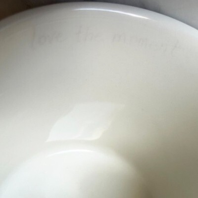 Natural Life mug is white with the letter A monogram in purple with floral design. Wording inside the mug, Love the Moment, is faint, as shown in the last photo. Cup measures 3-7/8" across the top and 3-5/8" high. Excellent condition overall.