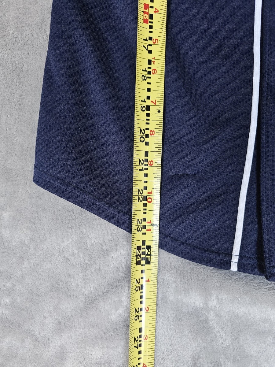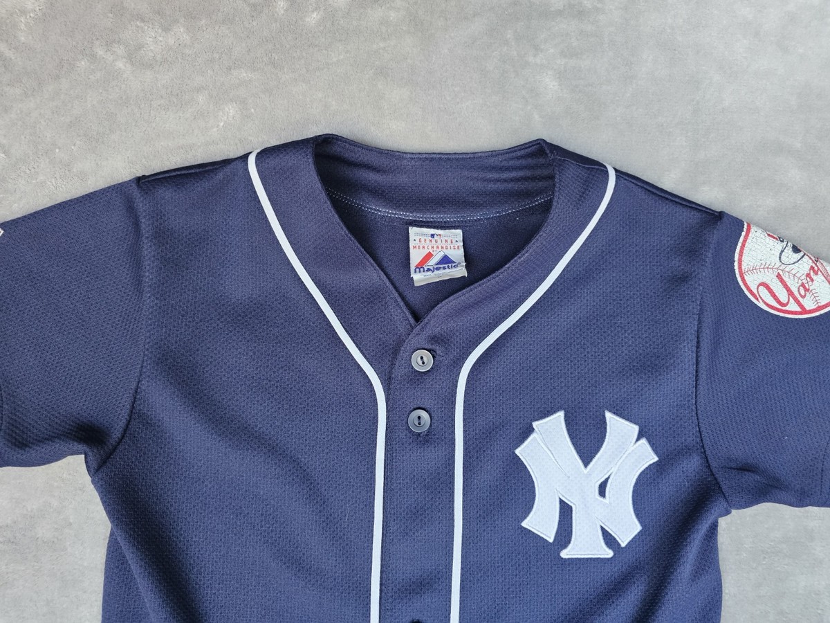 The product is a vintage Majestic New York Yankees Derek Jeter youth medium official MLB blue jersey. This officially licensed baseball jersey features the iconic player Derek Jeter and is in the team's signature blue color. Made for unisex children, this jersey represents the Major League (MLB) and is perfect for fans of the New York Yankees during the regular season. Crafted in Indonesia, this high-quality jersey is a must-have for any baseball enthusiast looking to show their support for the team and player.