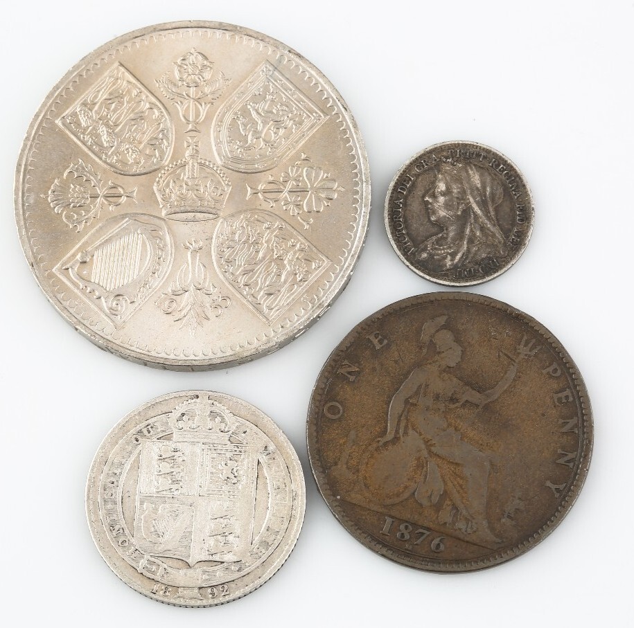 Great Britain Coin Lot 1876 Penny 1892 Shilling 1897 3 Pence 1953 Crown VF-UNC