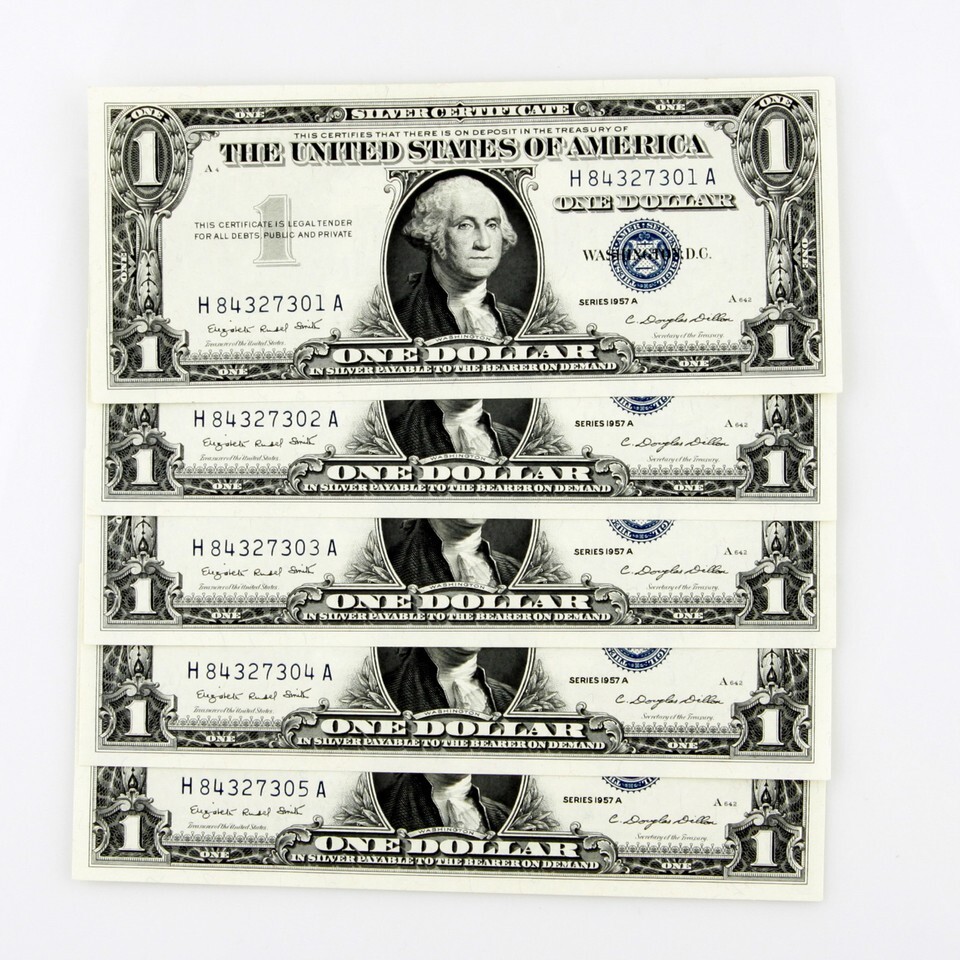 1957 A $1 SILVER CERTIFICATE CONSECUTIVE 5 BILLS H84327301A-H84327305A