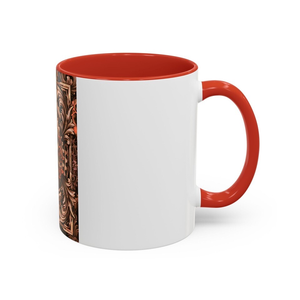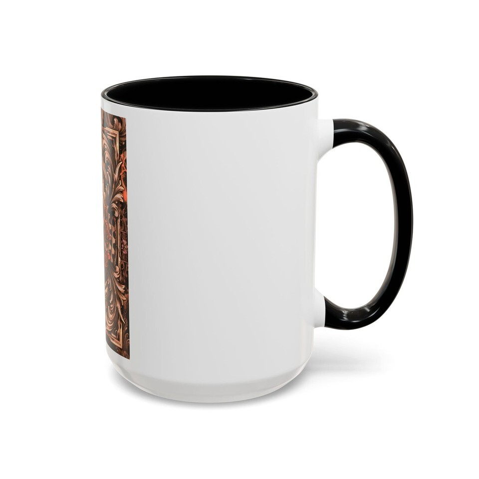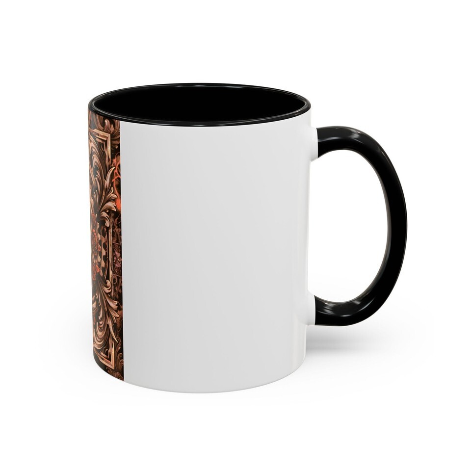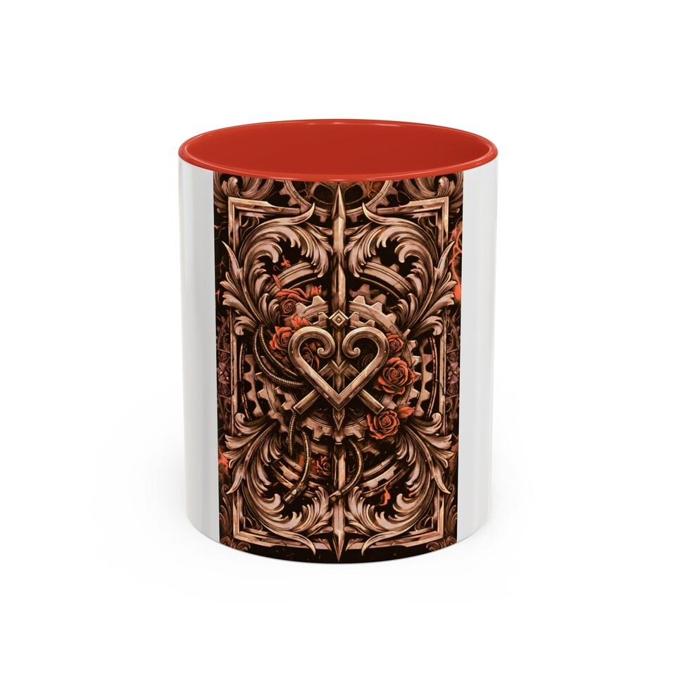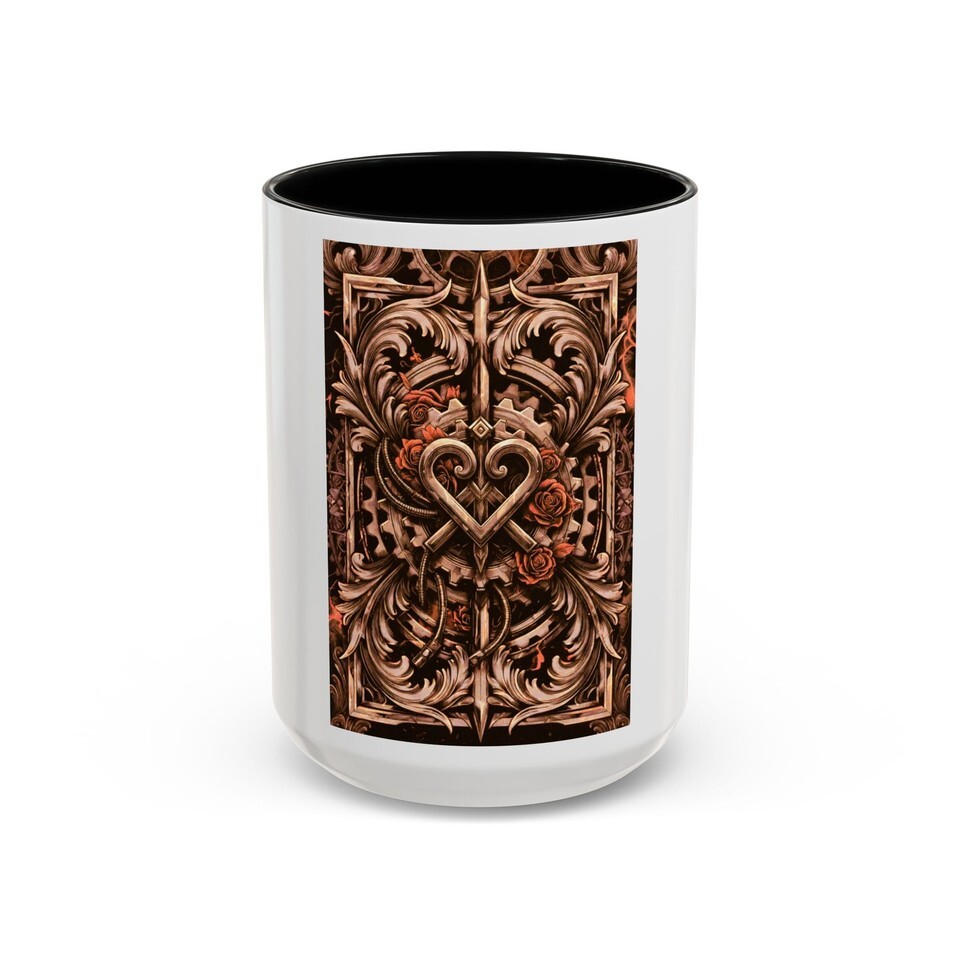 This ceramic accent mug brings warm, vintage character to your morning ritual. Intricate, carved-heart and floral motifs wrap the side panel in rich sepia tones, contrasting against a glossy white body and colored interior. The balanced C-handle and choice of 11oz or 15oz sizes make it comfortable to hold while the vibrant print keeps its detail through daily use. Safe for microwave and dishwasher, lead- and BPA-free, it?s a practical piece that carries an old-world, handcrafted feeling into everyday coffee breaks, writing desks, or cozy corners.