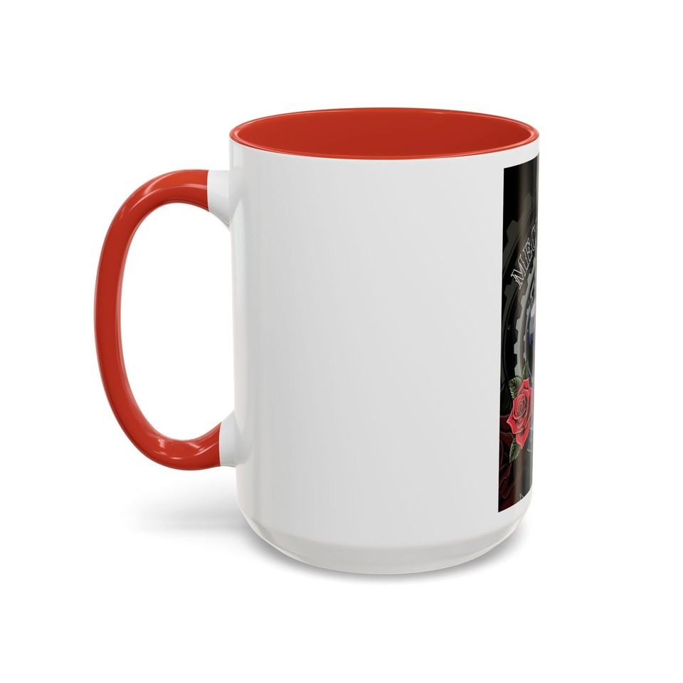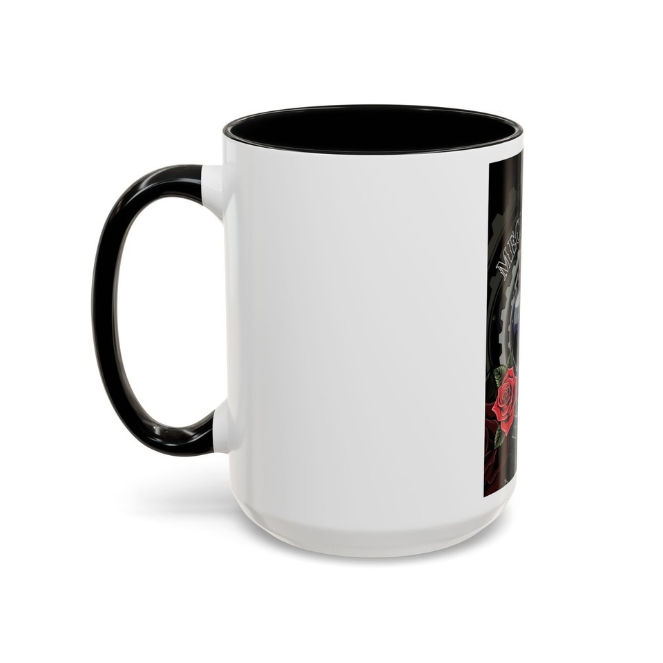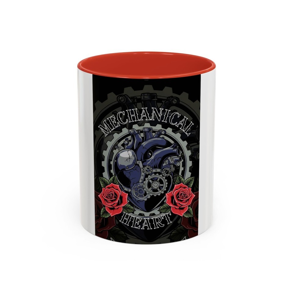 A bold ceramic mug that blends gritty industrial imagery with delicate floral accents. The design centers on a mechanical heart rendered in deep blues and metallic grays, framed by gears and two rich red roses?an aesthetic that balances toughness and tenderness. The glossy white exterior contrasts with a colored interior and handle, making the artwork pop while adding a striking edge to your morning routine. It warms with microwave use and cleans easily in the dishwasher, keeping the vivid print sharp and vibrant through everyday use. Lead- and BPA-free for safe daily sipping.