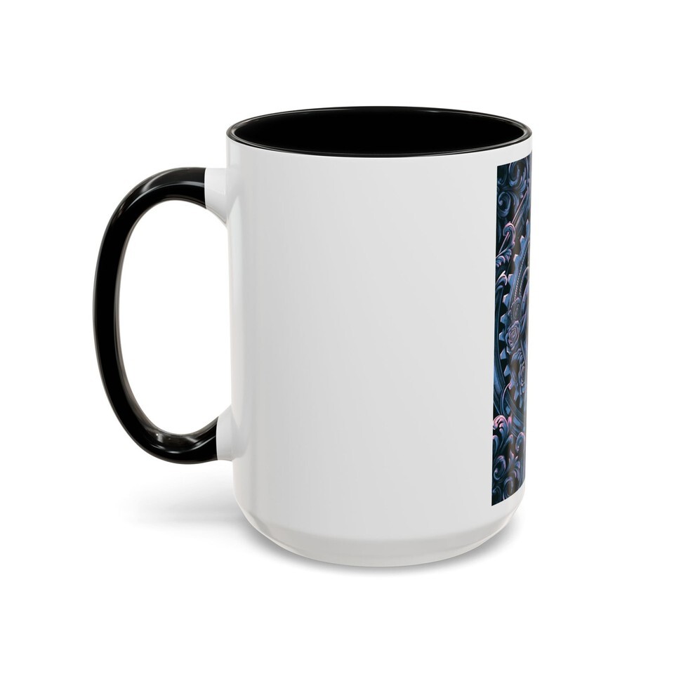 Warmth, story, and a little edge ? this ceramic mug brings ornate, vintage ironwork to your morning ritual. Deep indigo and slate tones curl into a heart-shaped medallion framed by roses and filigree, like a secret gate you find on a midnight walk. The colored interior and handle add a flash of contrast every time you lift it. It sits easily in your hands thanks to a comfortable C-handle and glossy finish that catches light like polished enamel. Use it for lingering coffee while sketching, a quiet read by lamplight, or to hold pens on your desk ? it adds atmosphere without shouting.