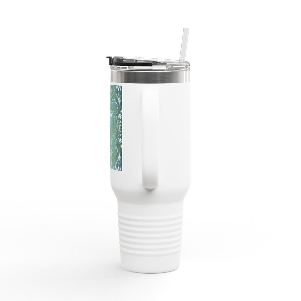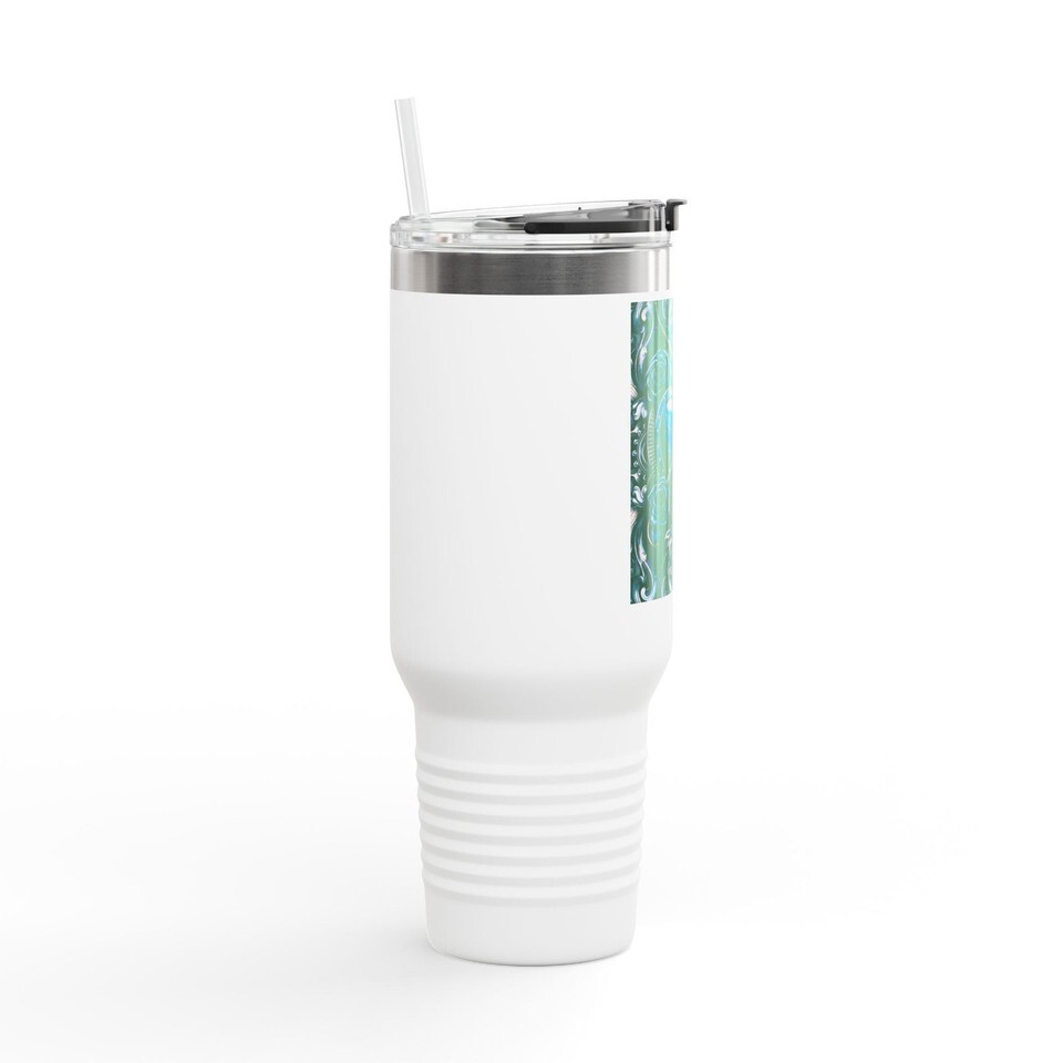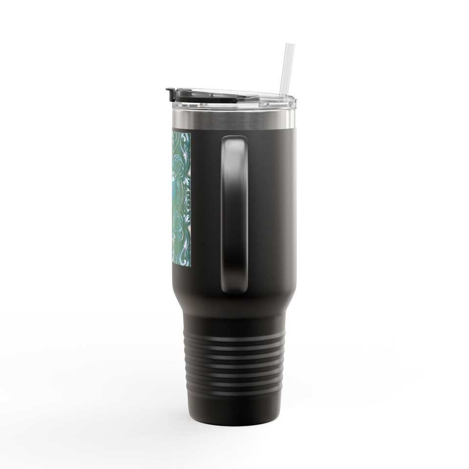 This 40oz insulated travel mug carries the quiet, steady energy of long drives, early mornings, and hands wrapped around something warm. The tall, slim silhouette holds a deep capacity for whatever fuels your day ? coffee, tea, or an iced blend ? while the double-wall stainless steel keeps temperature locked in for hours. A comfortable ergonomic handle and a leak-resistant lid with straw make it easy to sip on the move, from roadside diners to weekend work sessions. The textured powder-coat finish feels secure in your grip and the UV-DTF printed artwork adds a touch of handcrafted charm that ages gently with use. Choose a color that fits your vibe and bring a reliable, attractive companion on commutes, hikes, or creative days at the studio.