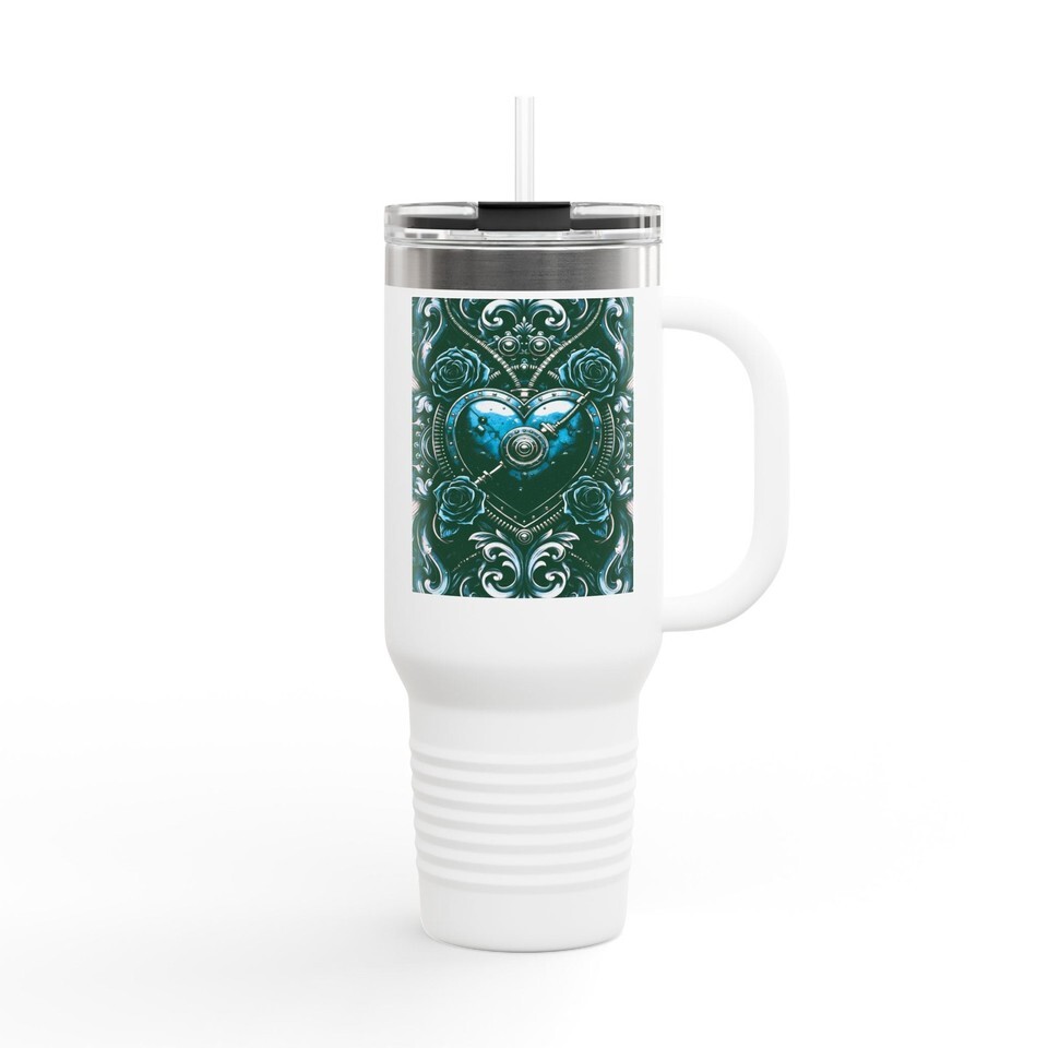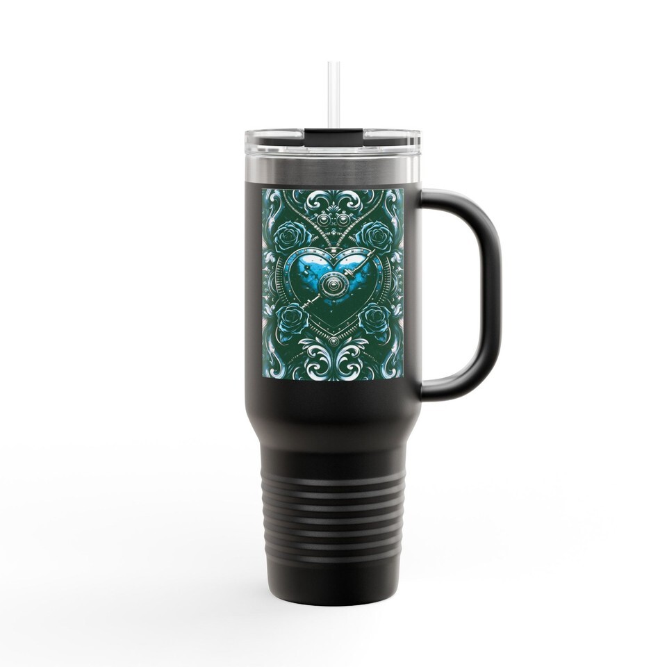 Victorian Steampunk Heart Lock 40oz Insulated Tumbler Filigree Teal Roses
