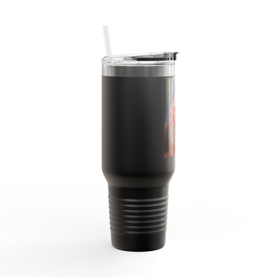This 40oz insulated travel mug brings durable function and bold style together. Thick double-wall stainless steel holds temperature for hours, while the ergonomic handle and included straw make long drives, workshop sessions, or outdoor shoots easier to carry and sip from. A powder-coated finish resists scratches and the leak-resistant push-on lid with latch keeps messes away. The printed design area showcases vibrant UV-DTF artwork ? a striking red rose set against industrial gears ? adding an edgy, handcrafted look that stands out on a morning commute or at a craft fair. Lightweight for its size, BPA-free, and available in multiple colors, this tumbler feels like a reliable companion for people who spend long days on the road or at creative stations.