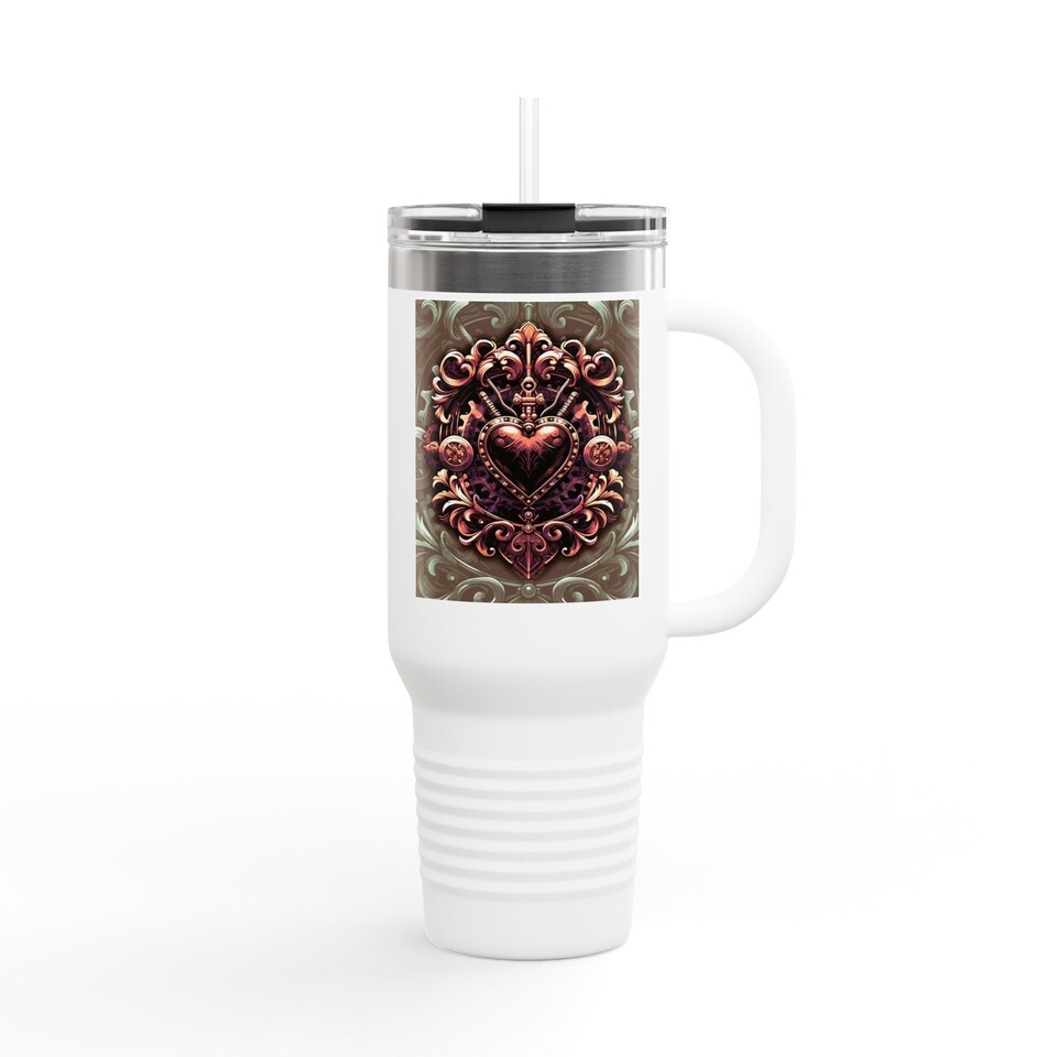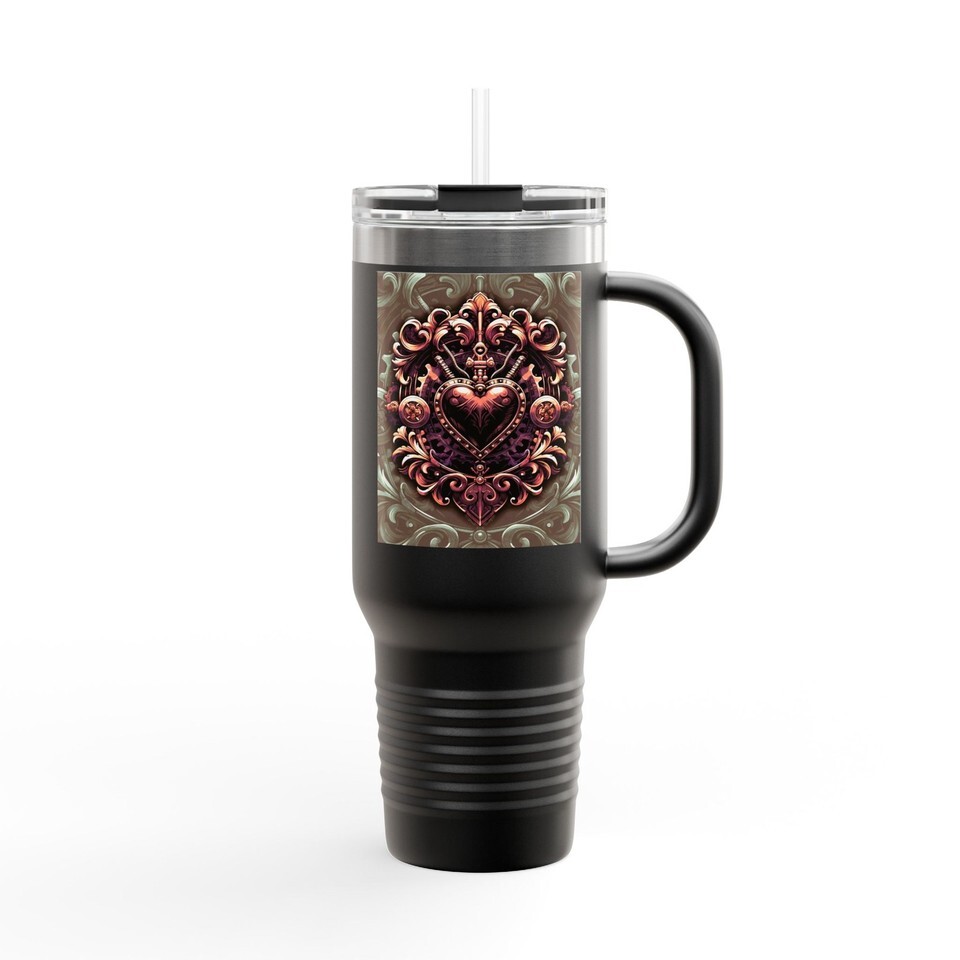 This 40oz insulated travel mug blends reliable performance with handcrafted charm. Thick double-wall stainless steel keeps coffee steaming on cold mornings and iced drinks crisp through long drives. A comfortable ergonomic handle and secure, leak-resistant lid make it easy to hold and sip on the move. The powder-coated finish adds texture and grip while showcasing a richly detailed, ornamental heart design?warm metallic tones on an embossed background?that feels personal and artful. Lightweight enough for road trips, rugged enough for outdoor days, and styled for anyone who likes their drinkware to carry a little handcrafted character.