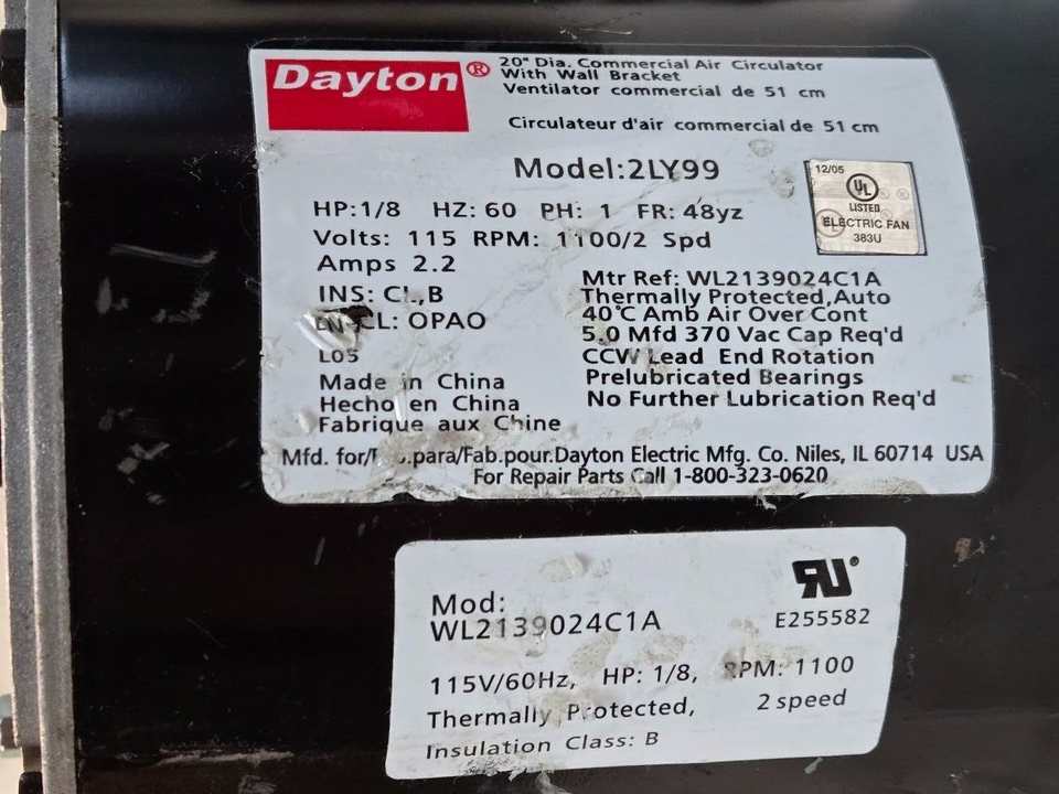 Dayton 2LY66 Motor WL2139024C1A | E255582 | 115V | 1100 RPM 2 Speed