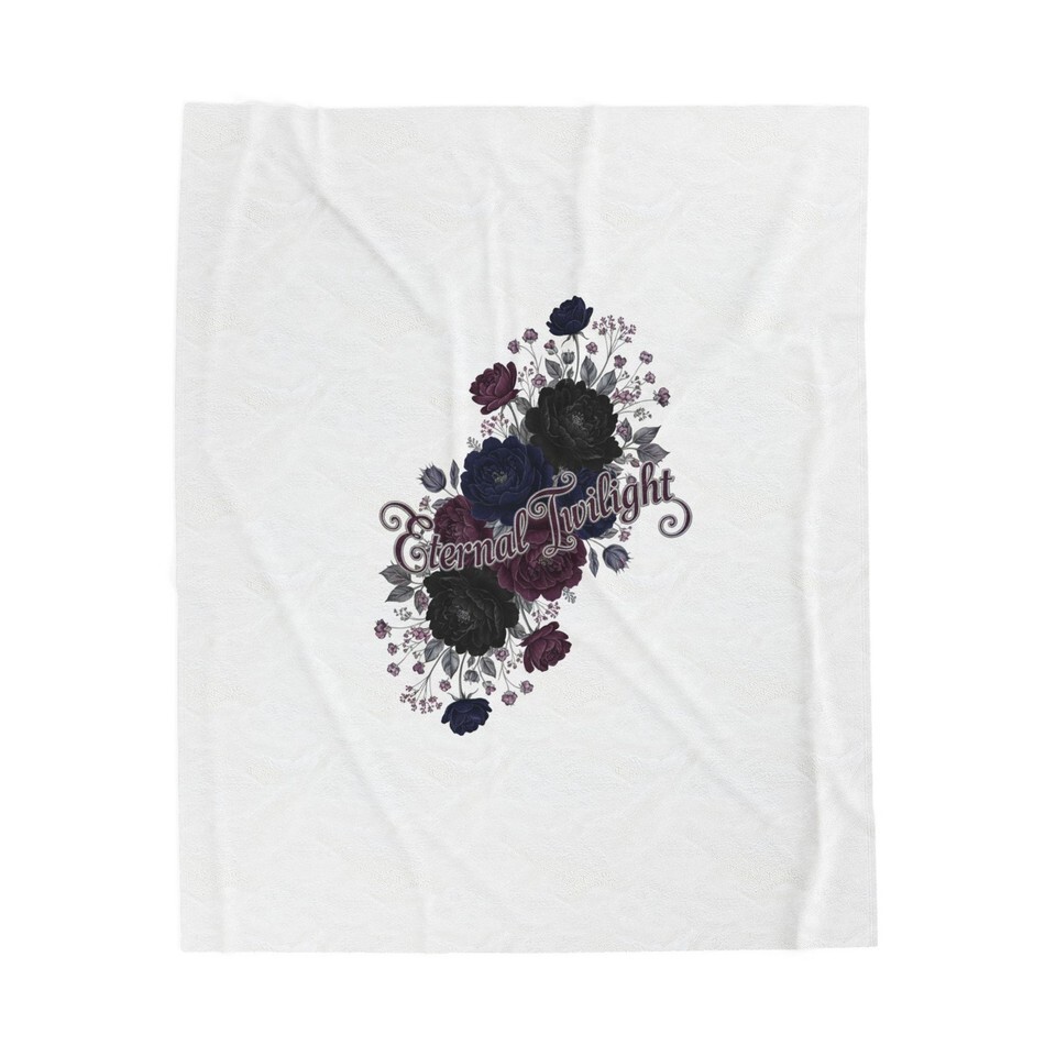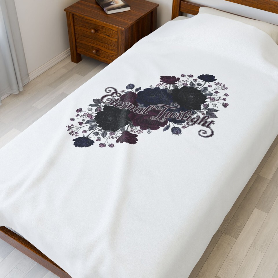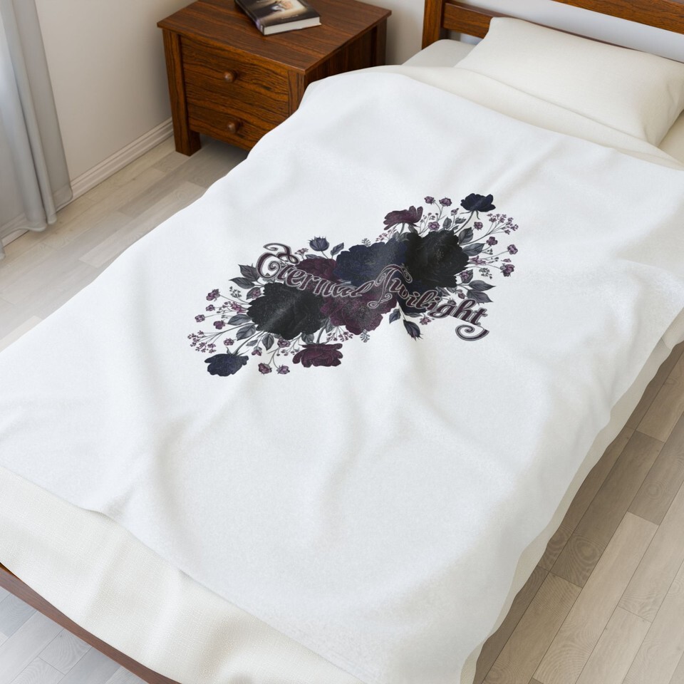 Moody dark-floral cluster printed on a plush velveteen blanket, blending inky black and plum roses with dusty foliage and an ornate vintage-style wordmark for a soft-gothic, nocturnal vibe. The artwork reads like a quiet, candlelit bouquet?romantic and slightly mysterious?designed to layer into alt and dark-season interiors or to drape over a lap during long evenings. Suited to shoppers following soft gothic florals and moody botanical design trends, it complements bookish, romantasy, and occult-adjacent aesthetics.