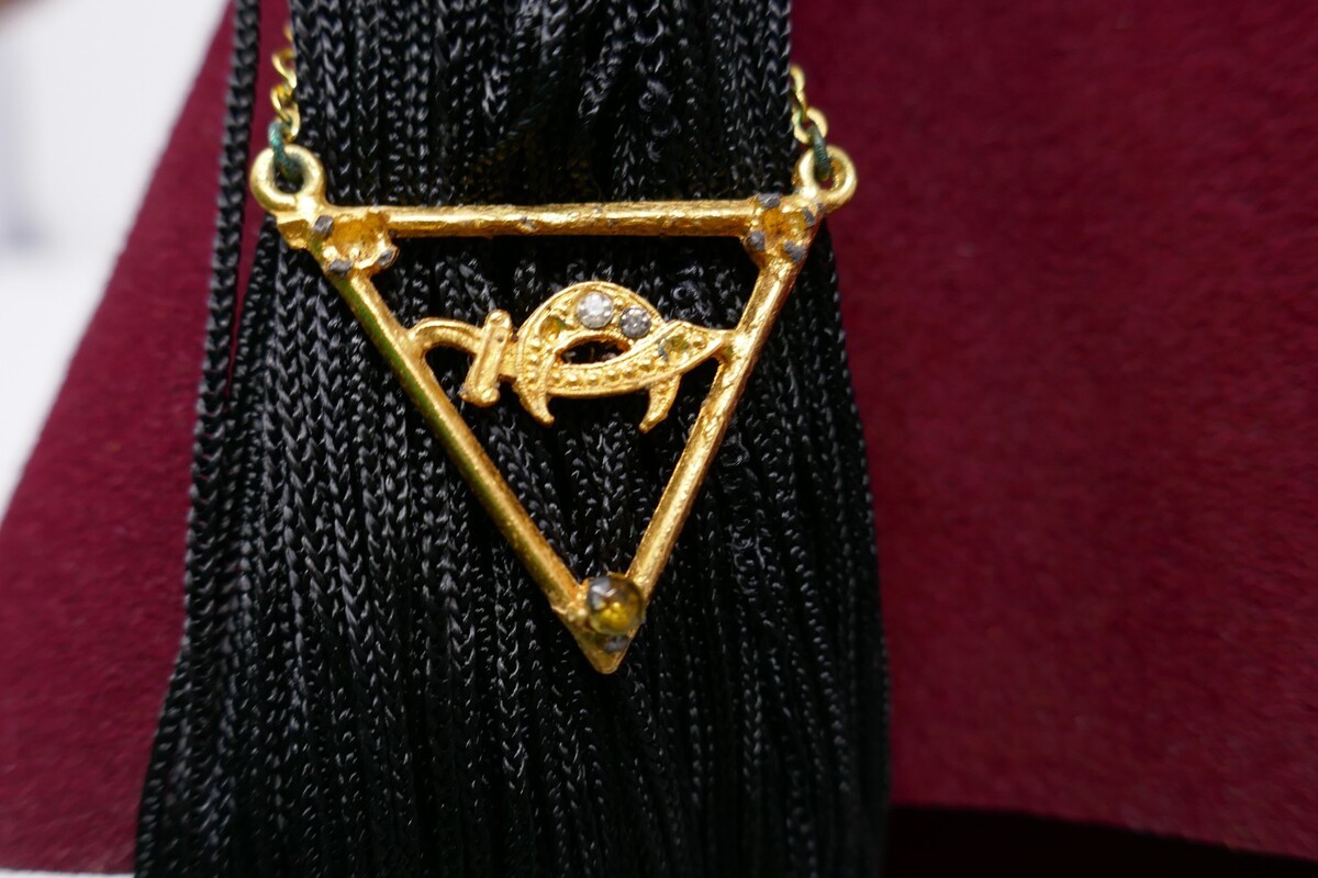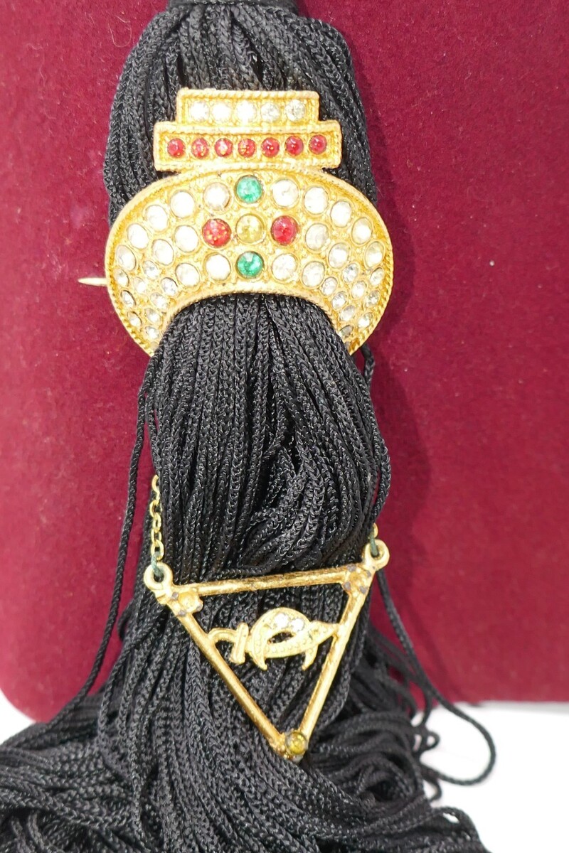 This is a Masonic Shriners Moslem embroidered Ihling Bros fez hat, originating from the United States. The hat has minimal wear to the top and the pin has some corrosion on the back and missing a stone in the middle of the triangle. Comes with a cloth bag. This collectible item is a unique piece of historical memorabilia that represents the Masonic organization and its associated fraternal group, the Shriners. The intricate embroidery and tassel detail add a touch of authenticity and tradition to this special hat accessory.